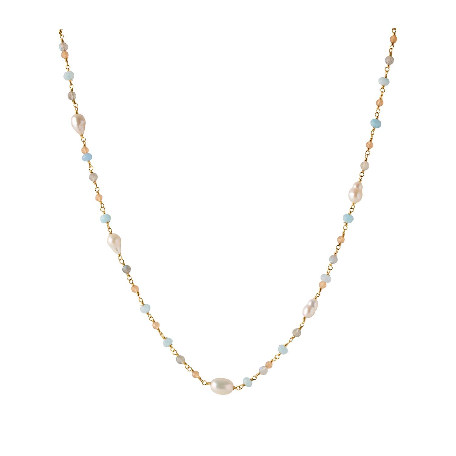 Halskæden er udsmykket med delikate perler og sten i bløde blå nuancer, der skaber en harmonisk balance mellem farve og form. De små detaljer i designet fremhæver halskædens unikke karakter og giver et sofistikeret udtryk. Den forgyldte kæde skinner smukt og tilføjer en varm glød til dit look.