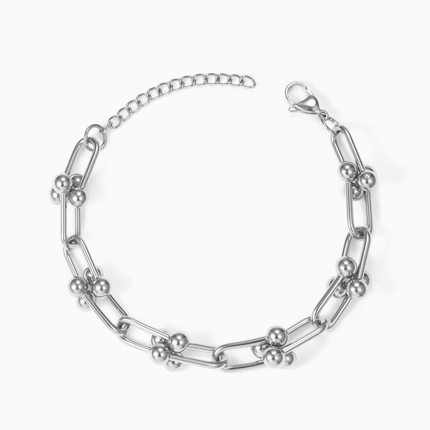 Armbåndet er sammensat af fine kædeled, der giver det et moderne og sofistikeret look. De små, polerede kugler, der pryder kæden, tilføjer en subtil detalje, der fanger lyset smukt. Dette skaber en dynamisk glans, der gør armbåndet til et iøjnefaldende tilbehør.
