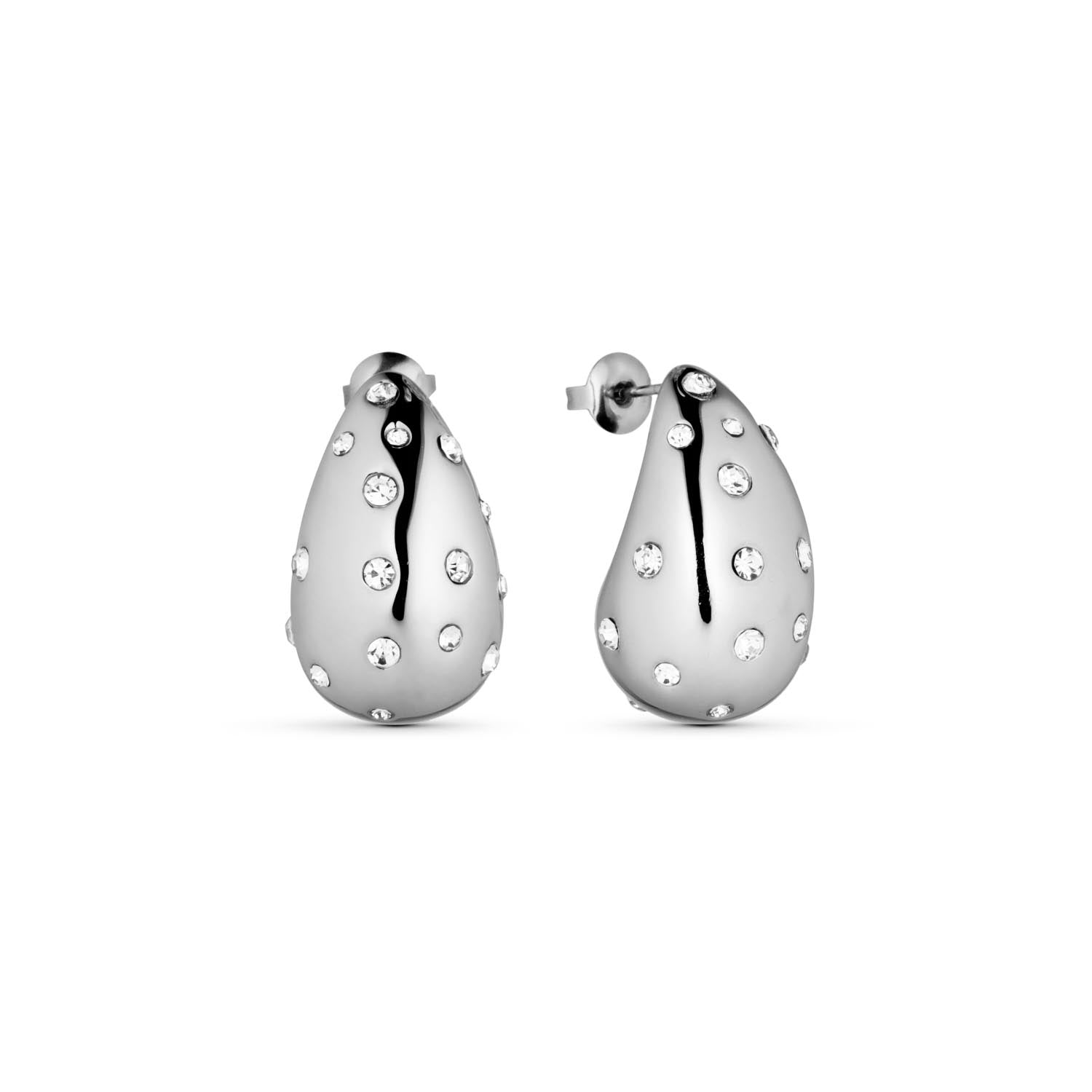 Øreringene har en glat, poleret overflade, der reflekterer lyset smukt og tilføjer en subtil glans til dit look. De små, indlejrede detaljer skaber en illusion af stjernestøv, hvilket giver dem en unik og iøjnefaldende karakter. Den sølvfarvede finish komplementerer enhver hudtone og stil, hvilket gør dem til et alsidigt valg for enhver garderobe.