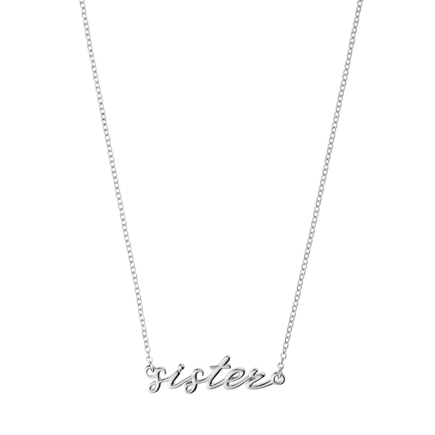 Halskæden måler 42 cm med en ekstra forlængelse på 3 cm, hvilket giver fleksibilitet til at tilpasse længden efter behov. Det delikate design fremhæver ordet "sister" i en smuk, flydende skrifttype, der tilføjer en personlig og kærlig detalje.