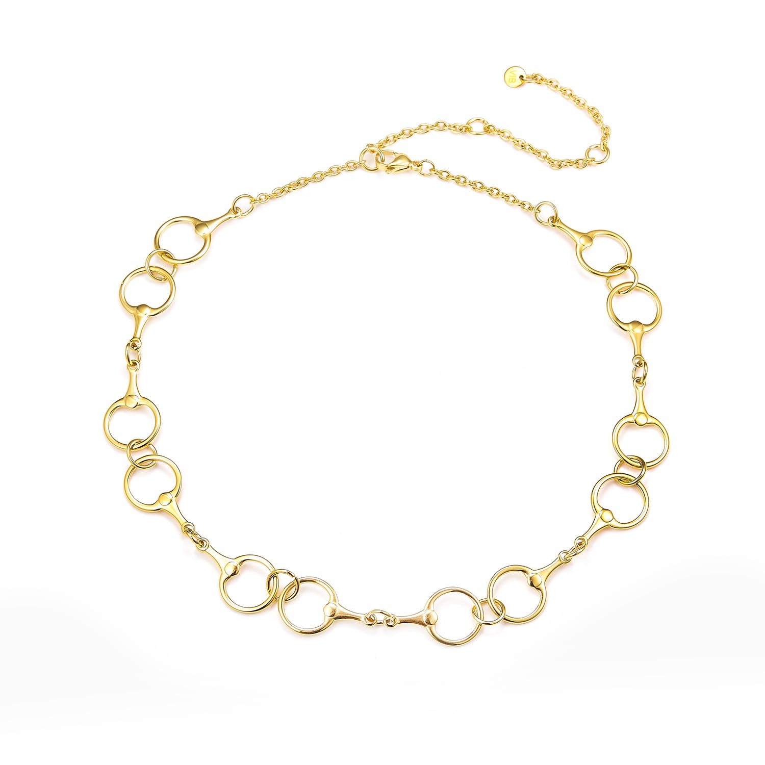 Halskædens design er præget af delikate cirkulære elementer, der elegant forbinder hinanden og skaber en harmonisk balance. Den gyldne farve reflekterer lyset smukt, hvilket giver et levende og dynamisk udtryk. Den glatte overflade føles behagelig mod huden og tilføjer et strejf af luksus til enhver lejlighed.