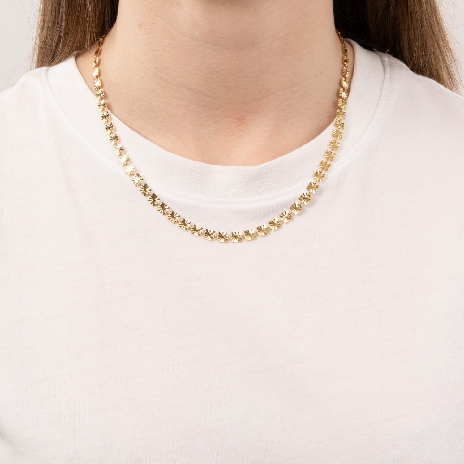 Halskæden er udsmykket med delikate, guldfarvede elementer, der fanger lyset smukt. De små, blomsterlignende detaljer skaber en subtil, men iøjnefaldende effekt, der fremhæver din naturlige skønhed. Den glatte overflade og den varme guldfarve giver en følelse af luksus og elegance, der gør den perfekt til både hverdag og særlige lejligheder. Kædens mønster på pladerne er identisk på for- og bagsiden.