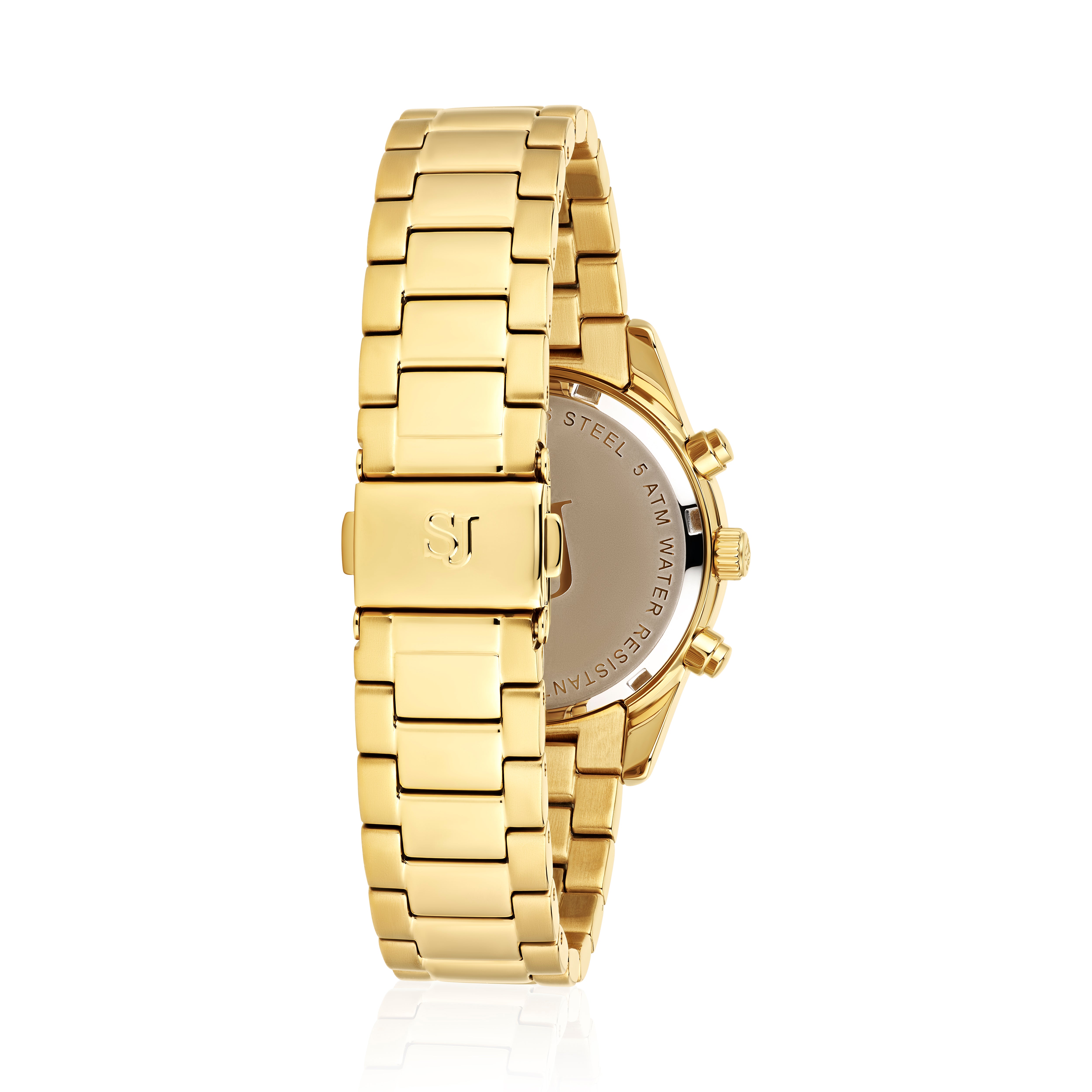 Dette ur er udført i guld PVD rustfrit stål, hvilket giver det en skinnende og holdbar finish. Den hvide urskive står i smuk kontrast til de gyldne detaljer, mens de indlagte zirkonia-sten tilføjer en subtil glans. Urets design er både moderne og klassisk, hvilket gør det velegnet til både hverdag og fest.