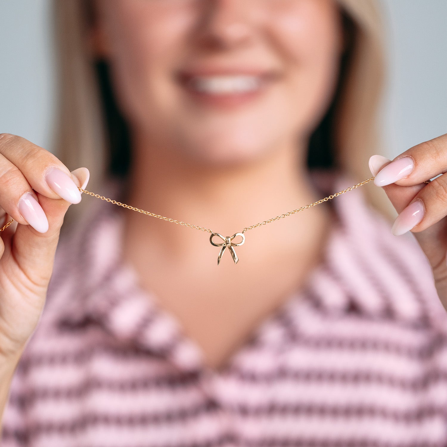 Bær dit engagement med stolthed. Denne smukke halskæde er designet i samarbejde med Støt Brysterne og formet som den ikoniske lyserøde sløjfe – et stærkt symbol på støtte, håb og sammenhold.