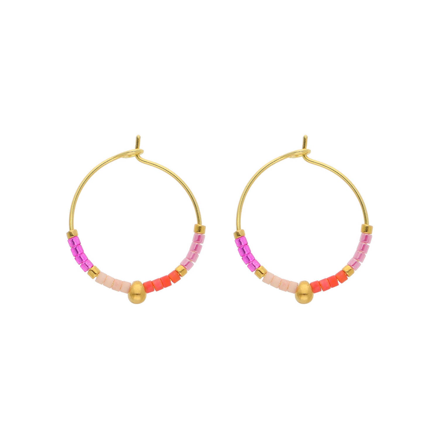 Øreringene er udført i 18 kt. forgyldt sterling sølv og prydet med glasperler, der tilfører et drømmende og farverigt udtryk. Denne kombination af materialer sikrer en holdbar og samtidig iøjnefaldende accessory. Med Nuni Copenhagens signatur på trendy og moderne smykker, får du et stykke tilbehør, der skiller sig ud og komplementerer din individualitet.