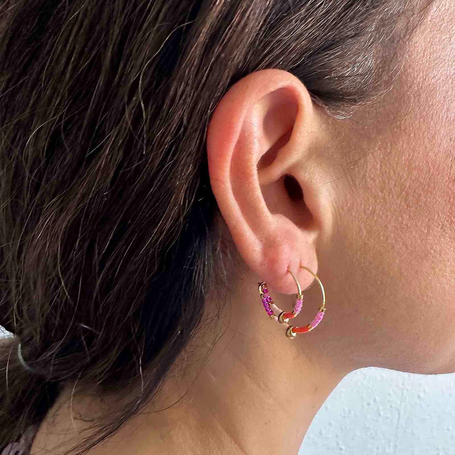 Med et blik på øreringene ser man straks de levende farver og den fine tekstur af de glitrende glasperler, der danser i lyset. De gyldne detaljer fanger øjet og skaber en harmonisk overgang mellem de varme og kolde farvetoner. Dette er et smykke, der taler til hjertet og giver en følelse af glæde hver gang det bæres.