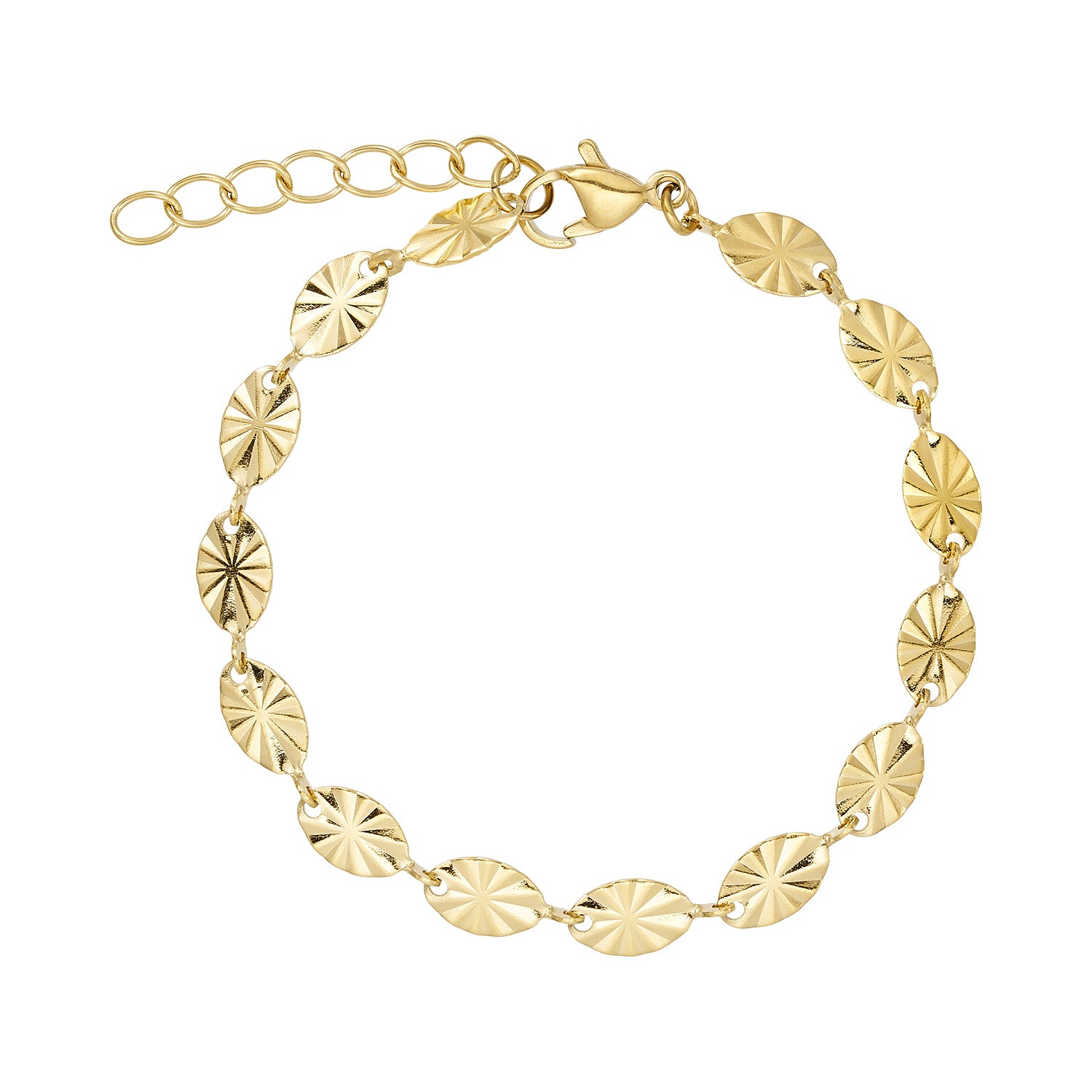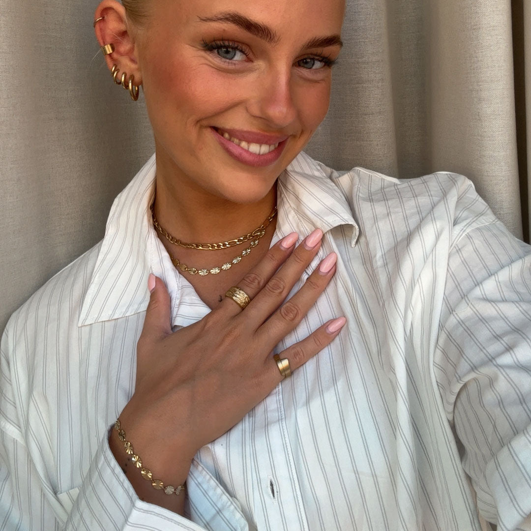 Den forgyldte overflade skinner smukt i lyset og tilføjer et strejf af luksus til dit look. Armbåndet er ikke kun smukt, men også praktisk, da det kan modstå daglig brug og påvirkninger fra forskellige elementer. Uanset om du er til sport, svømning eller blot ønsker et smykke, der kan tåle lidt af hvert, er Raio armbåndet det ideelle valg. Kædens mønster på pladerne er identisk på for- og bagsiden.