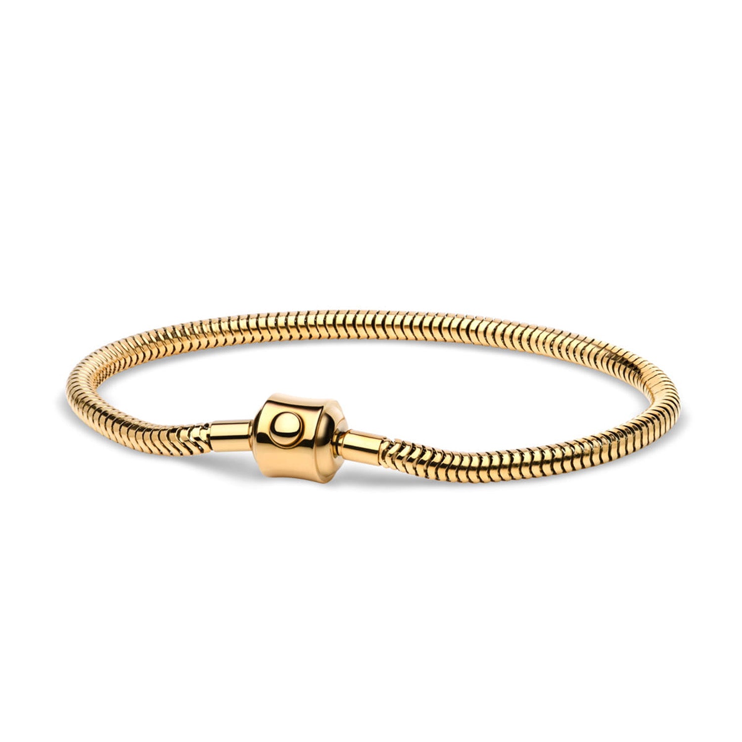 Armbåndets gyldne farve fanger lyset på en måde, der fremhæver dets raffinerede design. Den glatte overflade og den præcise udførelse gør det til en fornøjelse at bære, mens dets alsidighed gør det til en favorit i enhver smykkesamling.