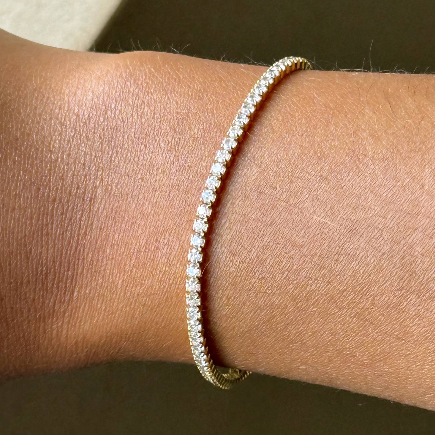Armbåndets guldfarve giver en varm og indbydende glans, mens de præcist indfattede zirkonia sten skinner som små lyspunkter omkring dit håndled. Denne kombination af farve og glans skaber en følelse af luksus og finesse, der komplementerer ethvert outfit. Tennis armbåndet fra View Jewellery er ikke blot et smykke, men et symbol på personlig stil og elegance, der gør det til den perfekte gave til hende, uanset om det er fødselsdag, jul eller bare en særlig anledning.