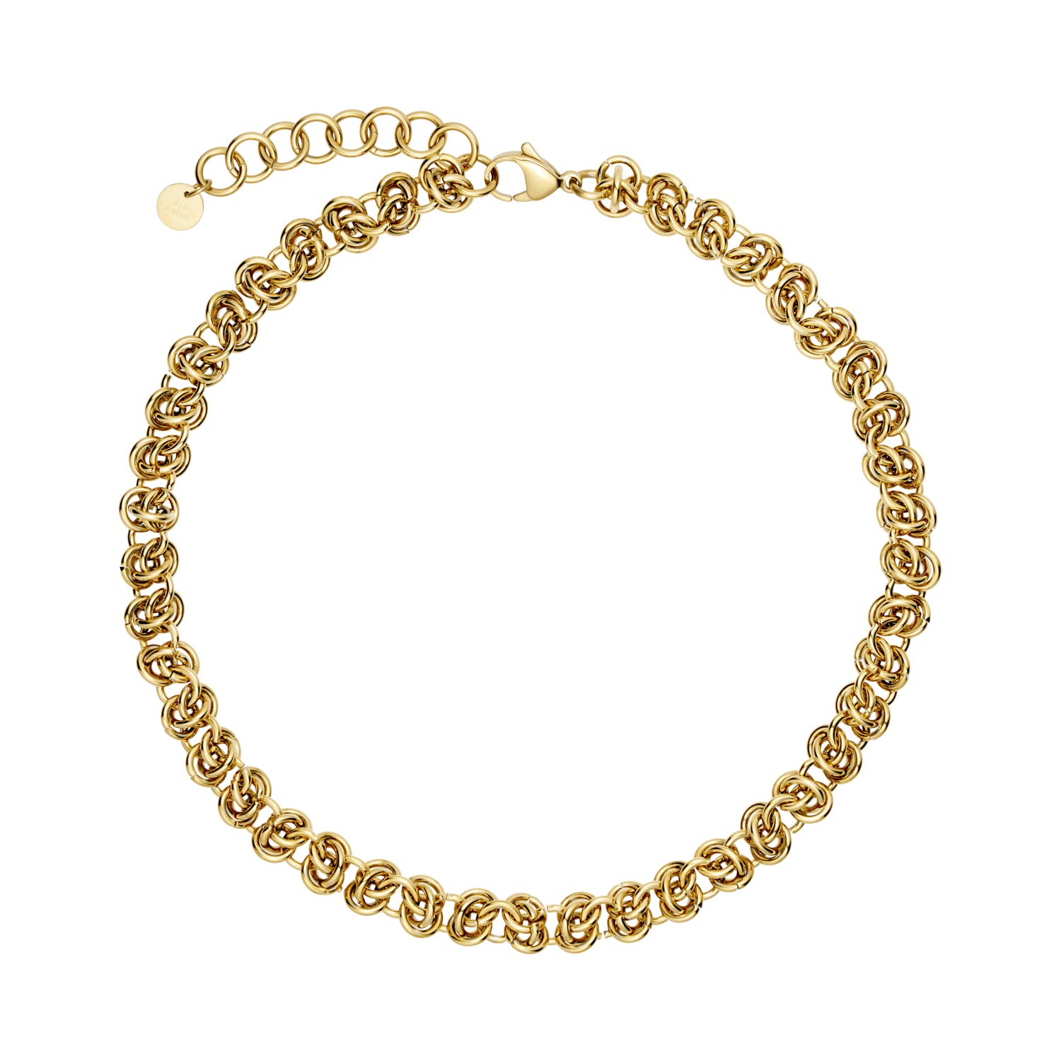 Den guldfarvede belægning giver halskæden en varm og indbydende glød, der komplementerer enhver hudtone. De indviklede kædeled skaber en smuk tekstur, der fanger lyset og tilføjer et subtilt skær til dit look.
