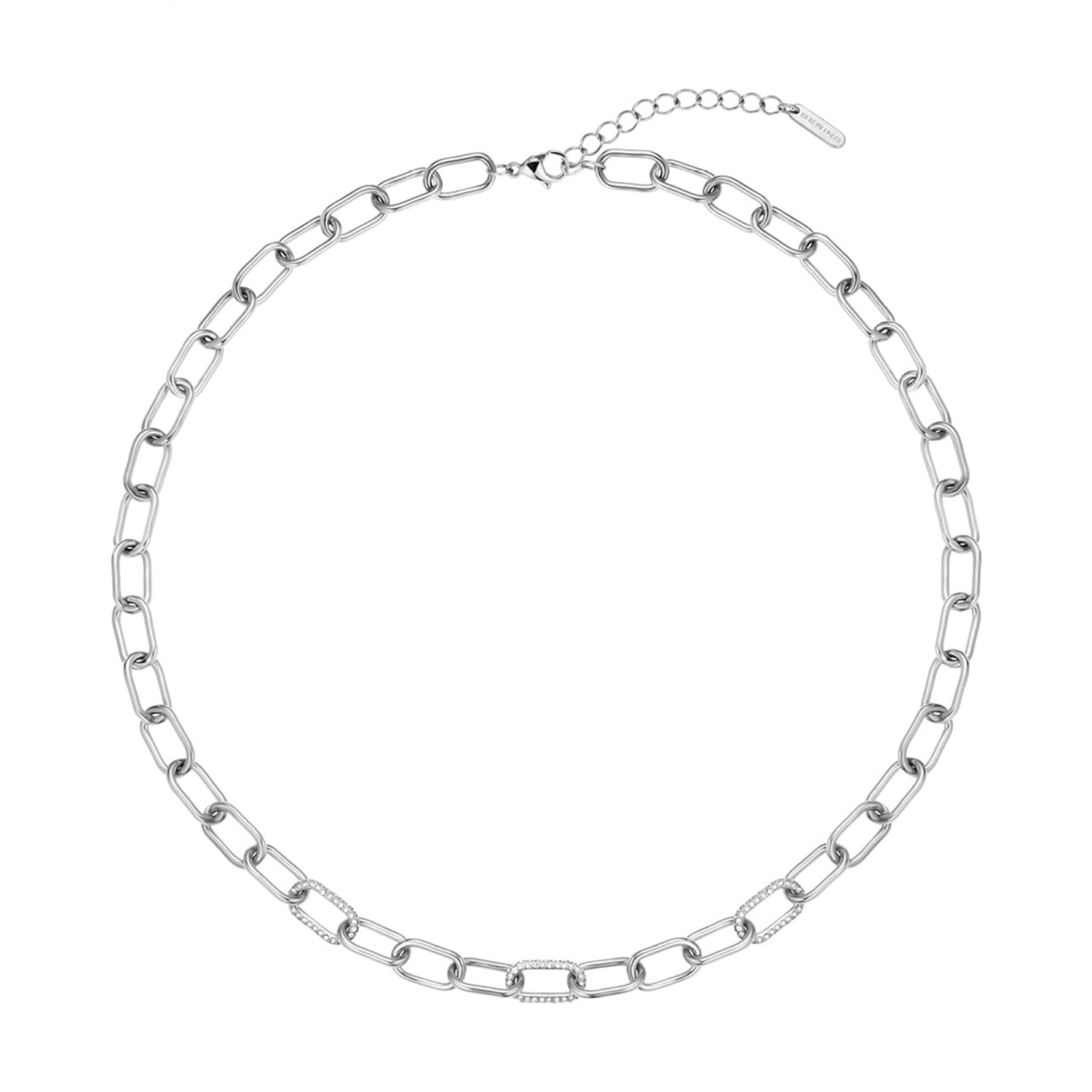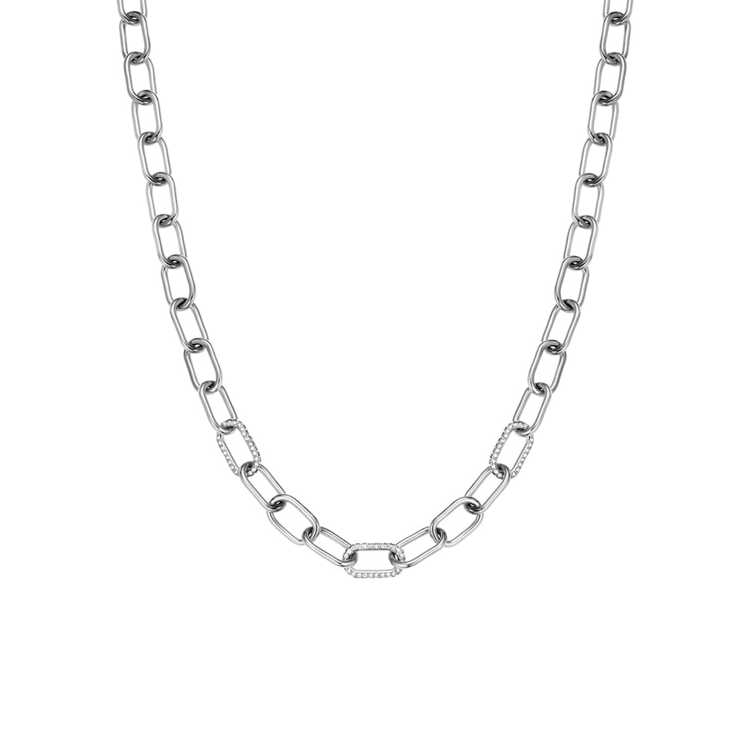 Halskæden er udført i skinnende sølvfarvet rustfrit stål, der giver et moderne og stilrent udtryk. Den glatte overflade reflekterer lyset smukt og tilføjer et subtilt skær til dit look. Med en længde på 45 cm ligger den perfekt om halsen og fremhæver din naturlige skønhed.