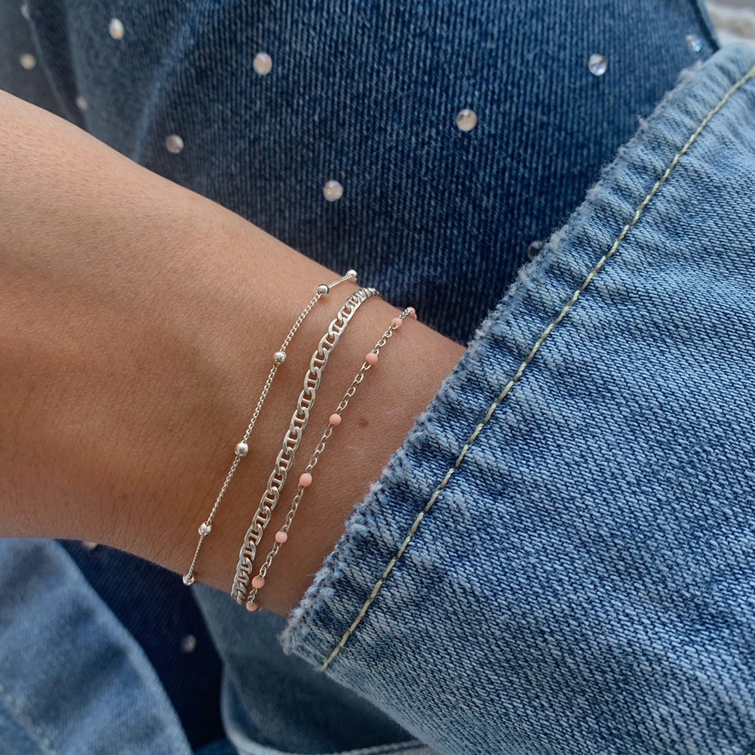 Opdag skønheden og elegance med Jeberg Jewellery's Rosewood armbånd. Dette fine smykke kombinerer det klassiske sterlingsølv med et strejf af farve gennem de små perler med rosa emalje. Det justerbare design gør armbåndet perfekt til enhver kvinde, der værdsætter både stil og komfort.
