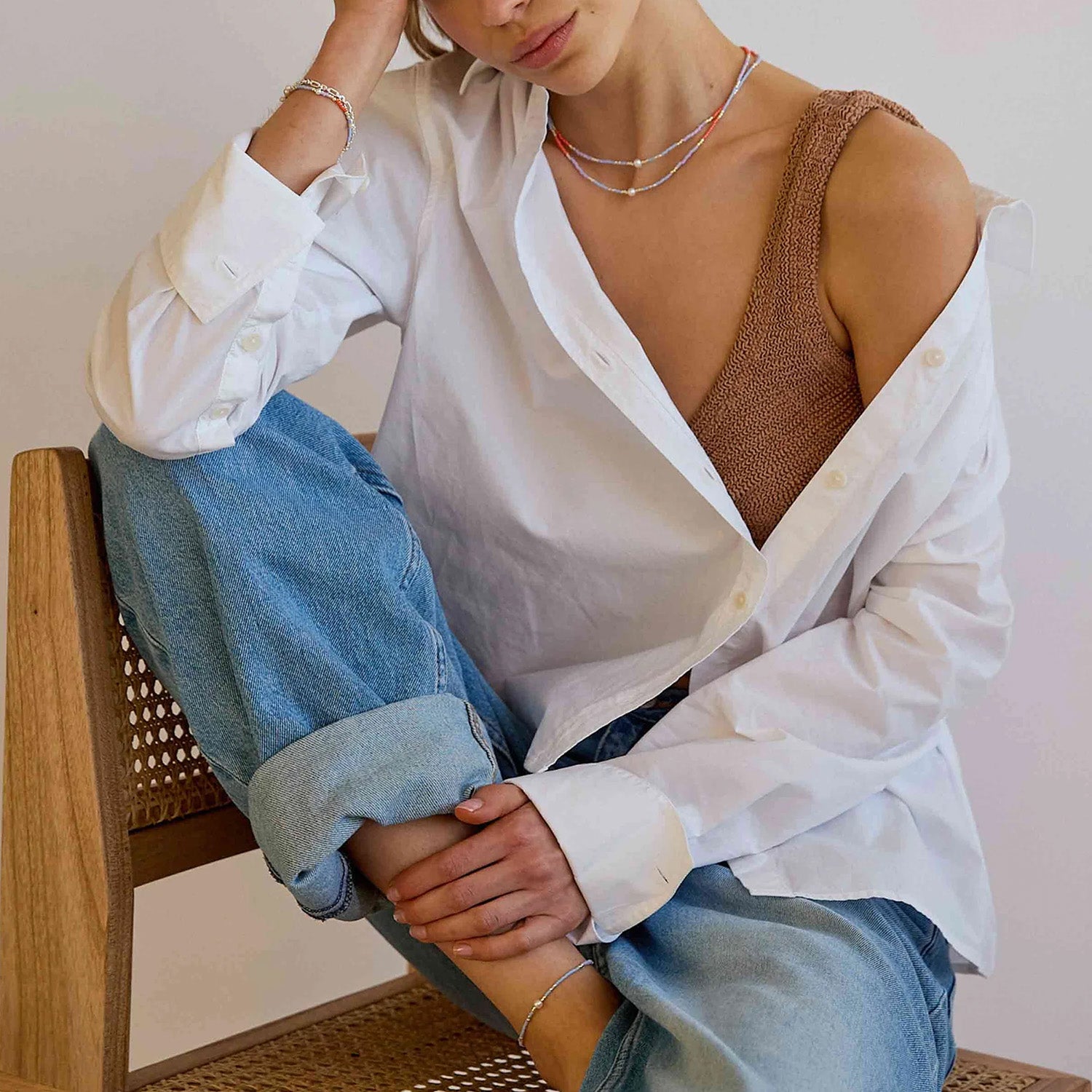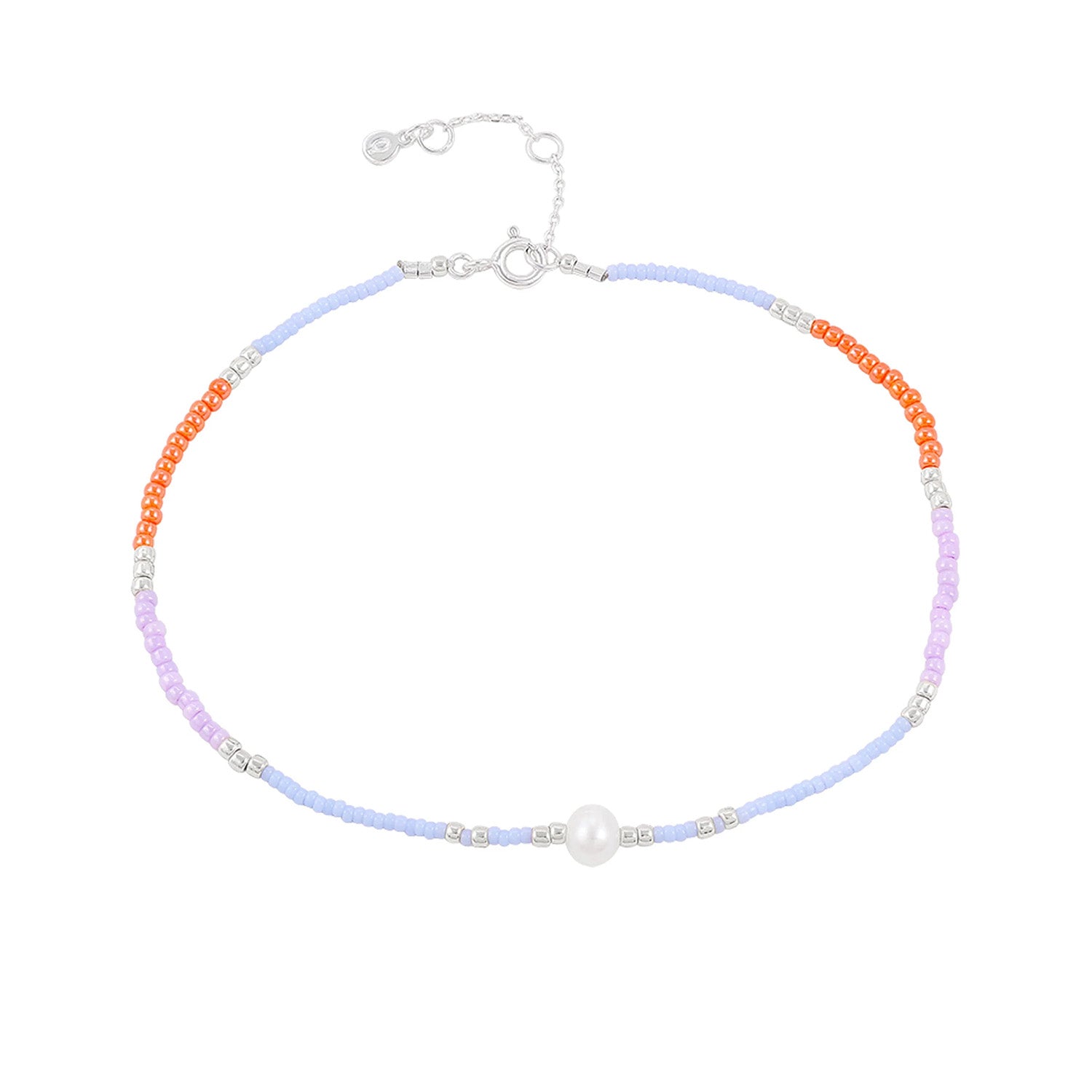 Den Avery ankelkæde er en fryd for øjet med sine delikate perler i bløde pastelfarver, der skaber en harmonisk balance mellem farverne. Den subtile kombination af lilla, orange og blå perler giver et legende, men sofistikeret udtryk. Den centrale perle tilføjer et strejf af elegance og gør kæden til et iøjnefaldende smykke.