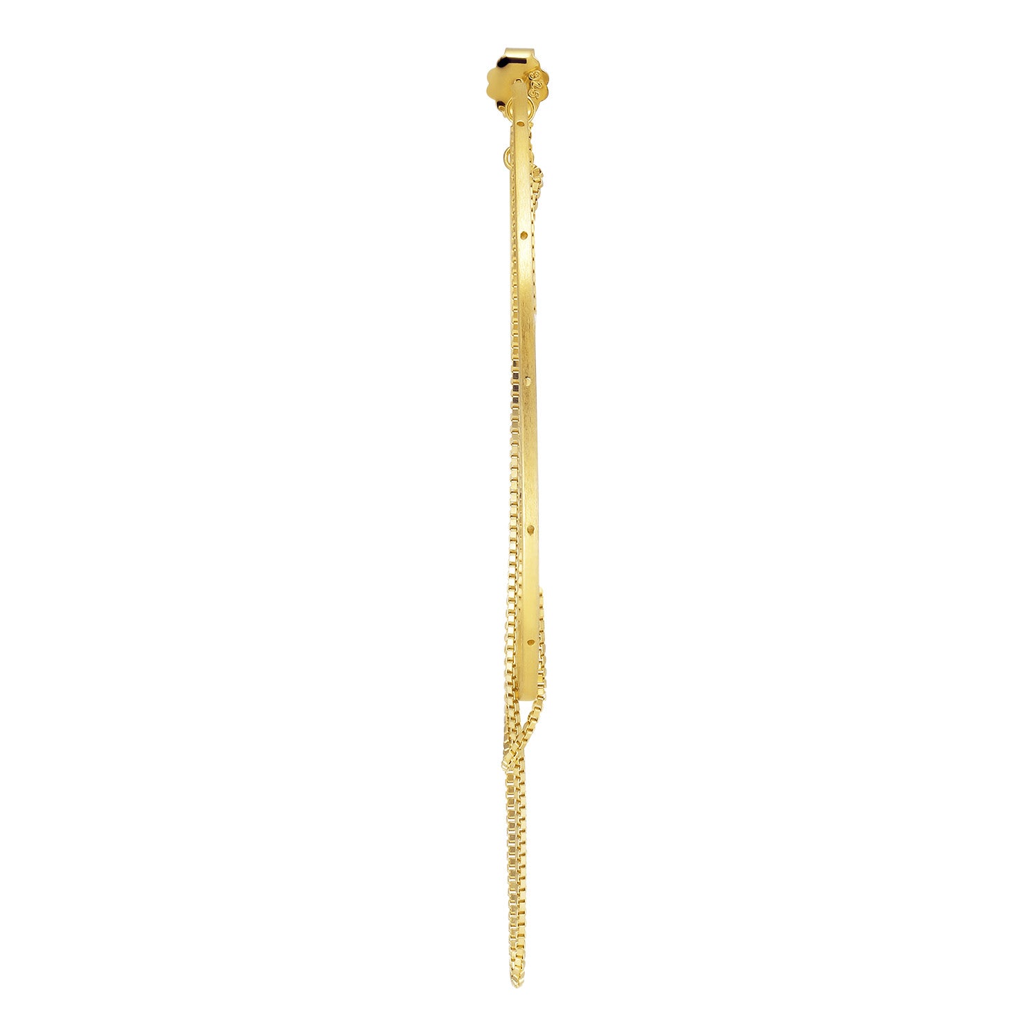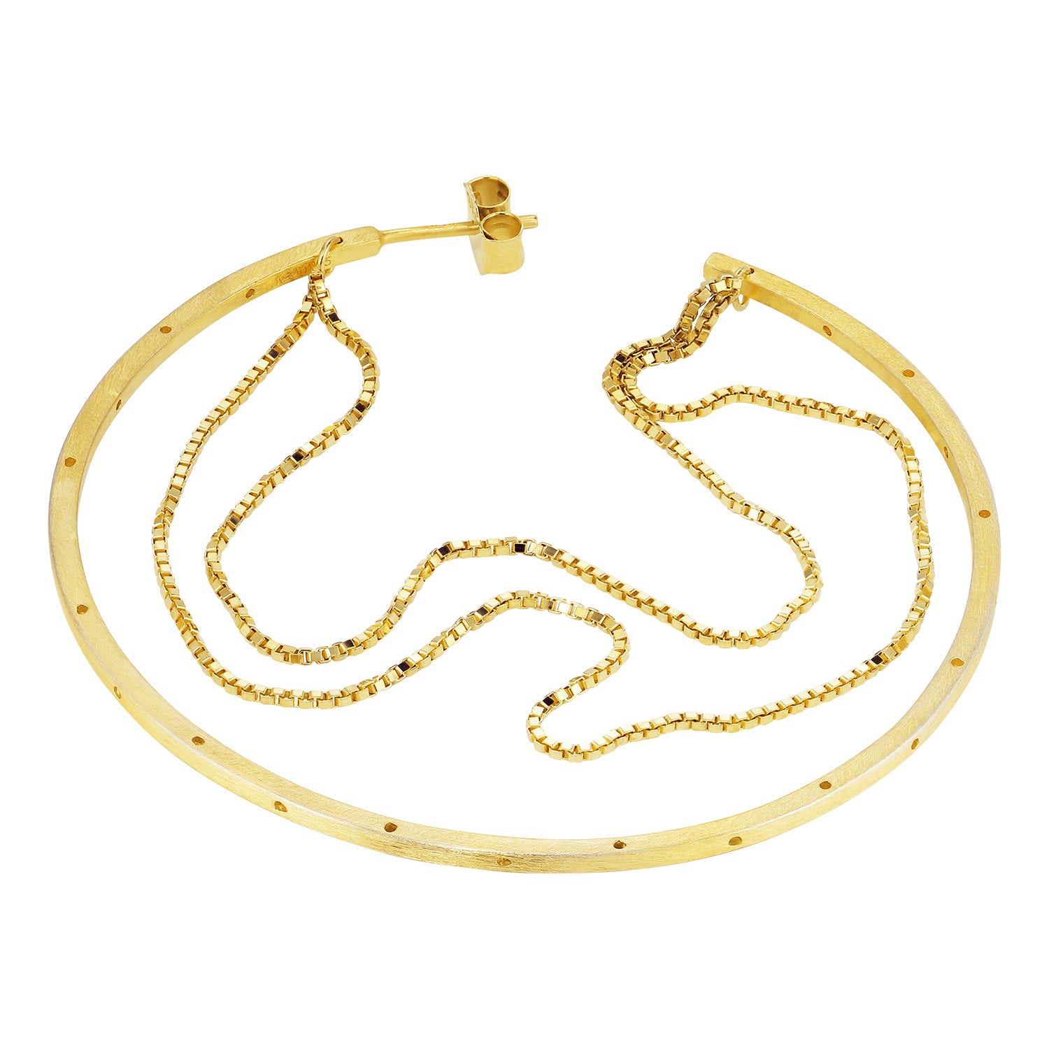 Øreringen er udført i forgyldt sølv, hvilket giver en varm og indbydende glød. Den slanke bøjle er prydet med en delikat kæde, der hænger elegant og skaber bevægelse og liv. Den gyldne farve fremhæver smykkets raffinerede detaljer og tilføjer et strejf af glamour til dit look.