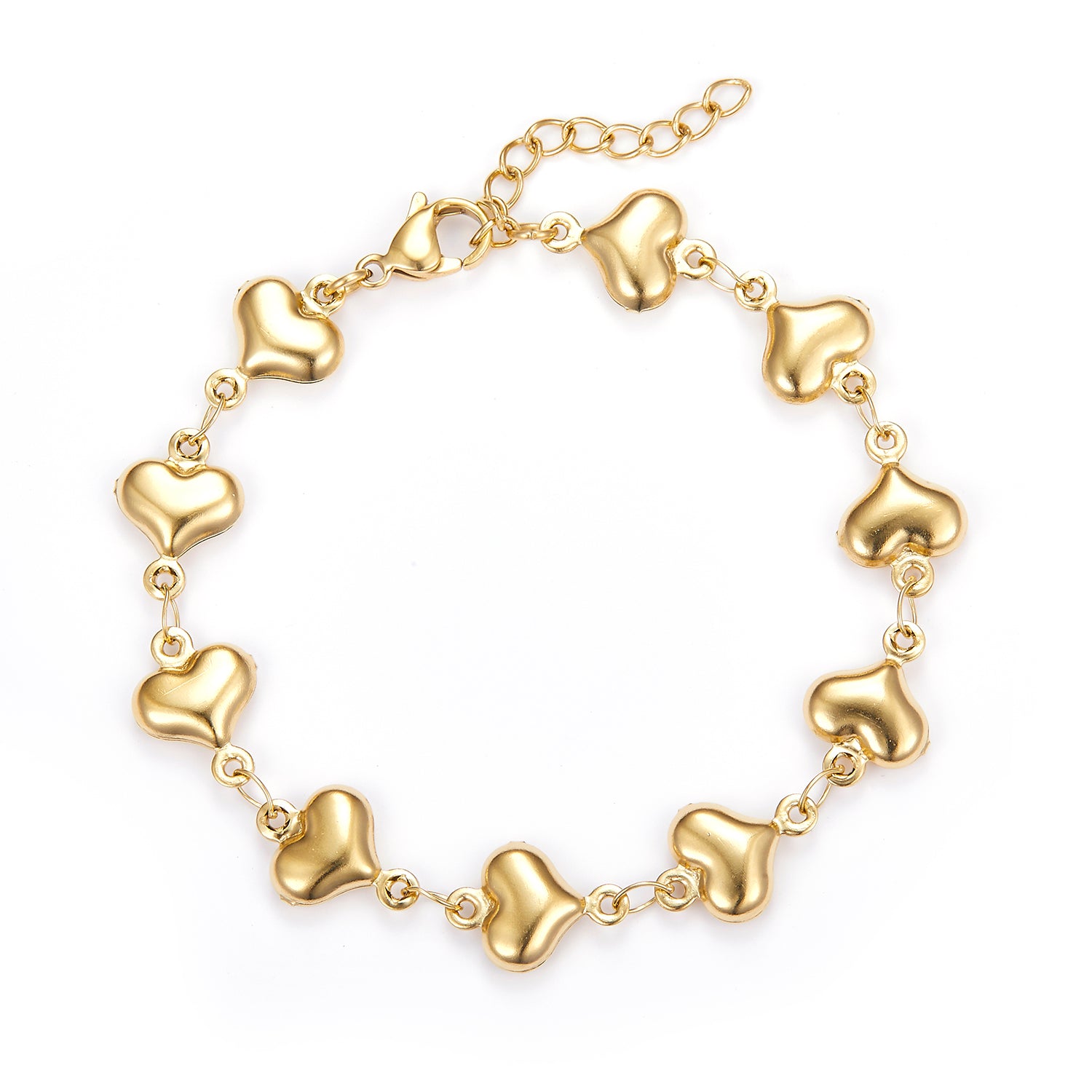 Armbåndet består af delikate hjerteformede led, der skaber en romantisk og feminin æstetik. Den gyldne farve fremhæver armbåndets elegante design og giver en varm glød, der komplementerer enhver hudtone. Den glatte overflade sikrer en behagelig følelse mod huden, mens den robuste konstruktion lover langvarig holdbarhed.