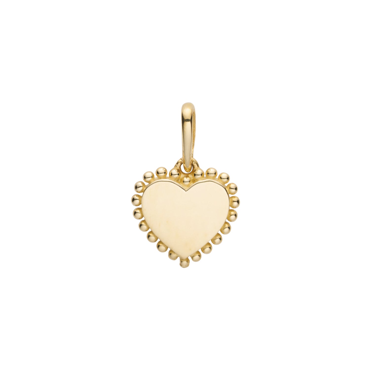Det gyldne vedhæng har en glat og skinnende overflade, der fanger lyset smukt og fremhæver dets varme glød. De små kugler, der omkranser hjertet, tilføjer en delikat detalje, der gør smykket endnu mere unikt. Det er et vedhæng, der ikke kun ser fantastisk ud, men også føles behageligt at bære.
