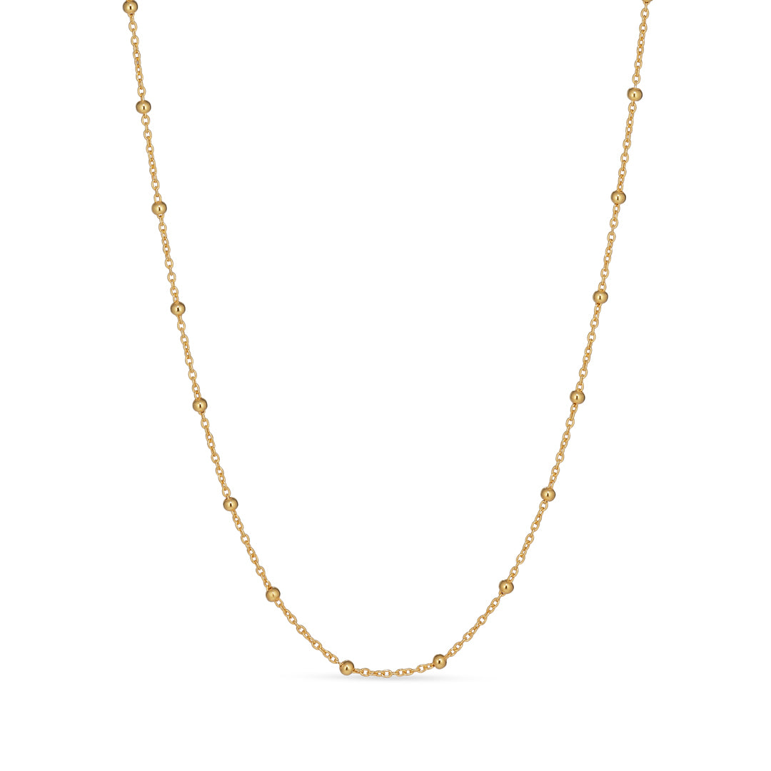 Halskæden er udsmykket med små, delikate kugler, der skaber en subtil, men iøjnefaldende effekt. Den forgyldte finish giver en varm glød, der komplementerer enhver hudtone. Med en længde på 42+1+1+1 cm kan du nemt justere kæden til den ønskede længde, så den passer perfekt til din stil.