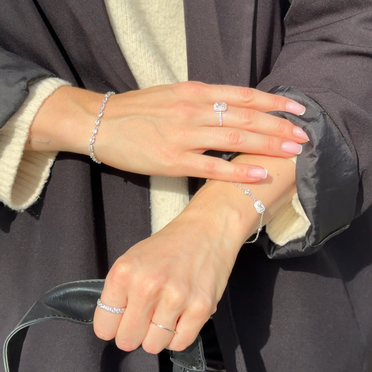 De funklende zirkonia-sten er mesterligt indfattet, hvilket giver et sofistikeret udtryk, der fanger lyset og øjet. Den centralt placerede baguette slebet zirkonia er hjertet i dette design, der tilfører en unik karakter og dybde. Dette armbånd er ikke bare et smykke, det er en historie om skønhed og luksus, der venter på at blive fortalt på dit håndled.