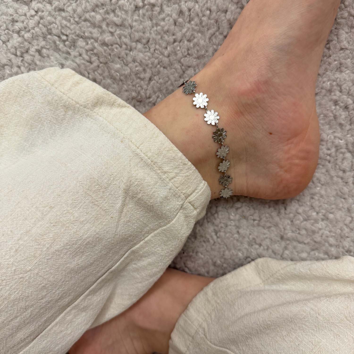 Designet af Girassol ankelkæden er inspireret af naturens skønhed. De delikate blomsterdetaljer, som ses på billedet, tilføjer et feminint touch, der fanger lyset på en subtil måde. Den sølvfarvede finish giver et moderne udtryk, der let kan kombineres med andre smykker. Når du bærer denne ankelkæde, vil du føle en lethed og elegance, der komplementerer din personlige stil.
