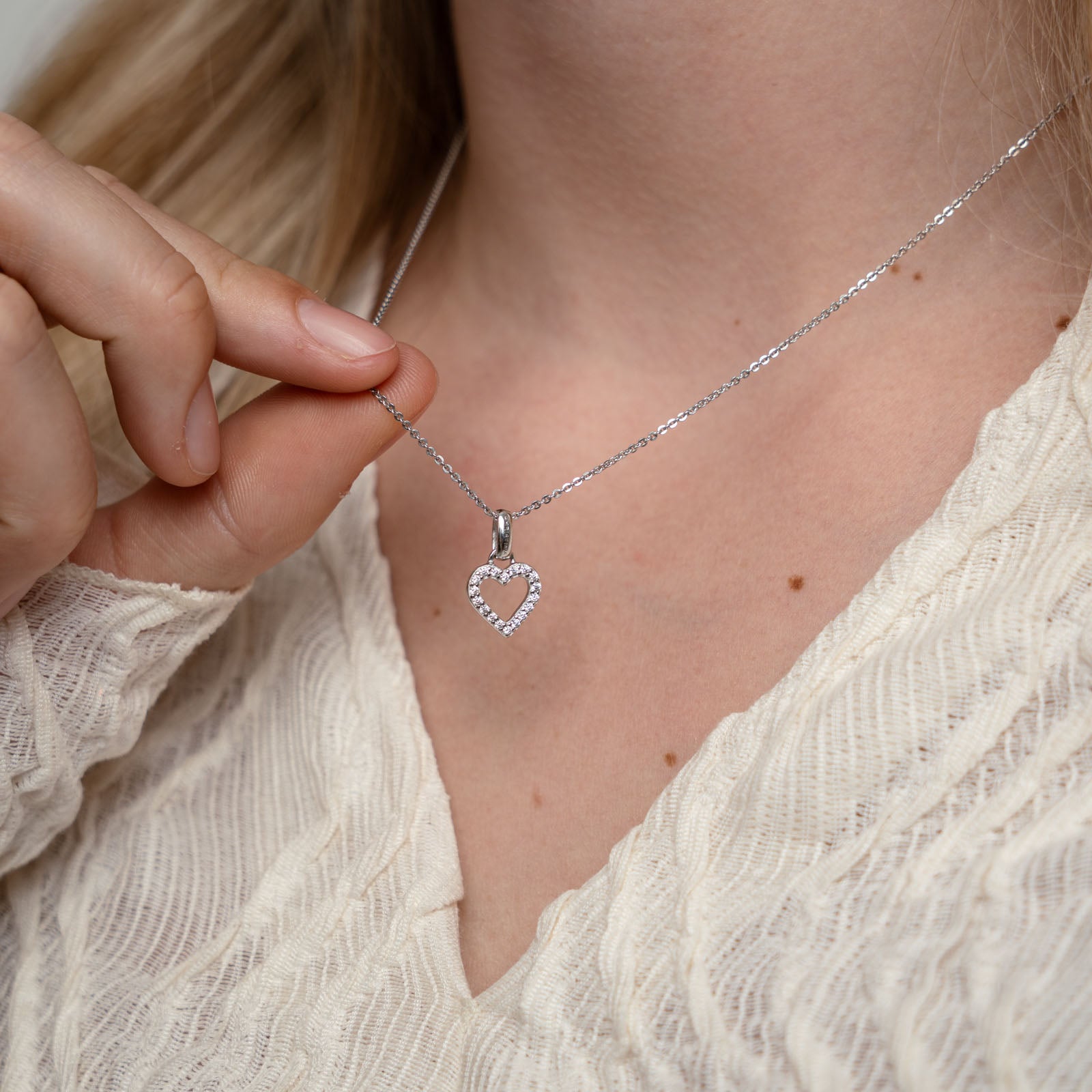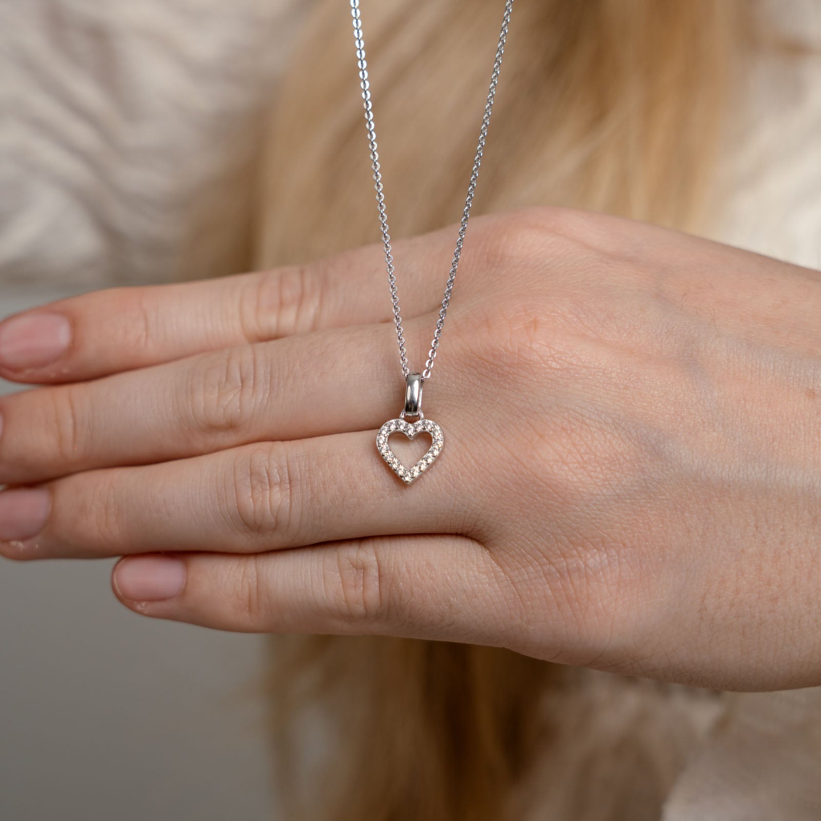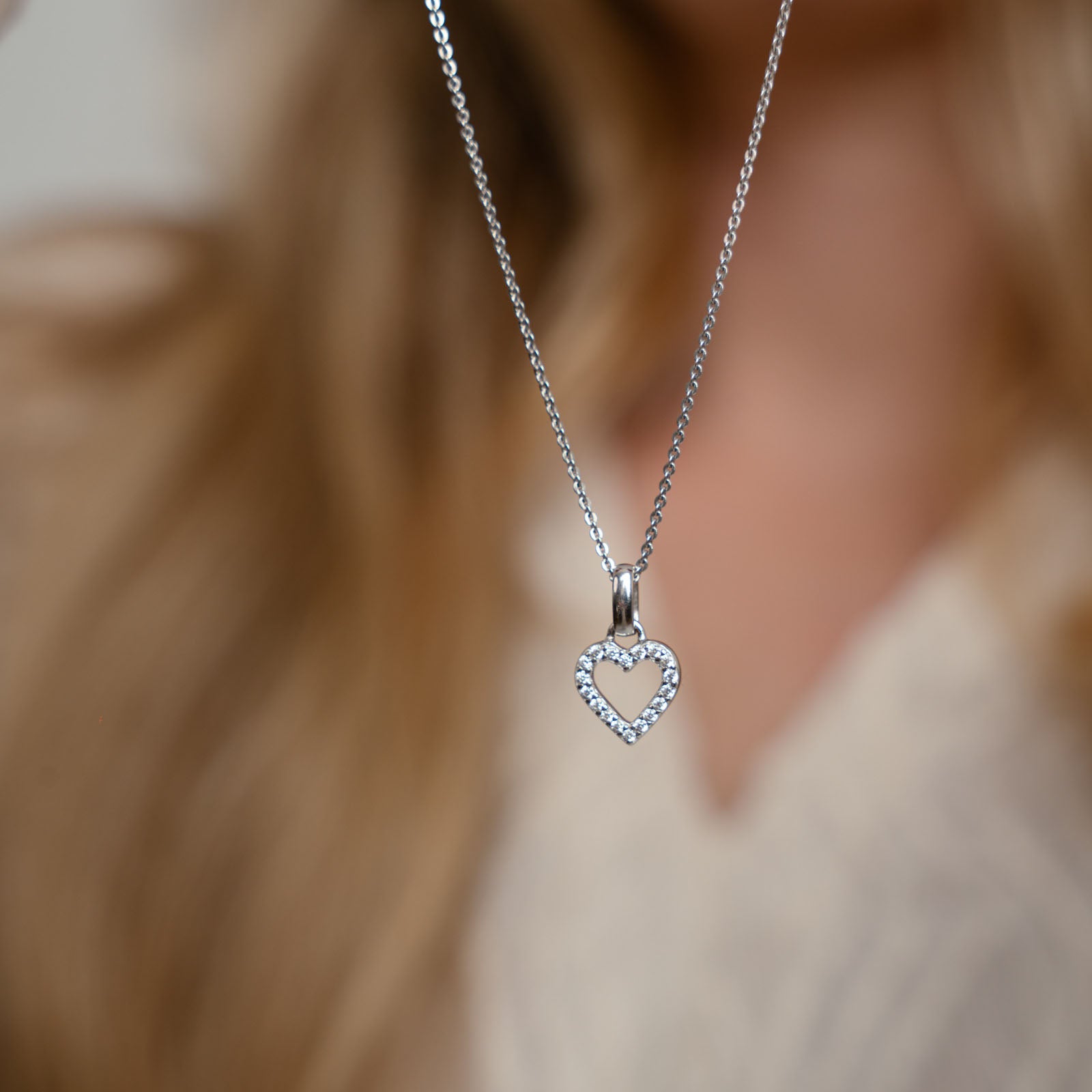 Dette vedhæng er udført i skinnende sølv, der fanger lyset på en måde, der fremhæver dets delikate detaljer. Den åbne hjerteform giver et let og luftigt udtryk, mens den glatte overflade tilføjer en sofistikeret finish. Det subtile design gør det nemt at kombinere med andre smykker, hvilket giver mulighed for at skabe et personligt look.