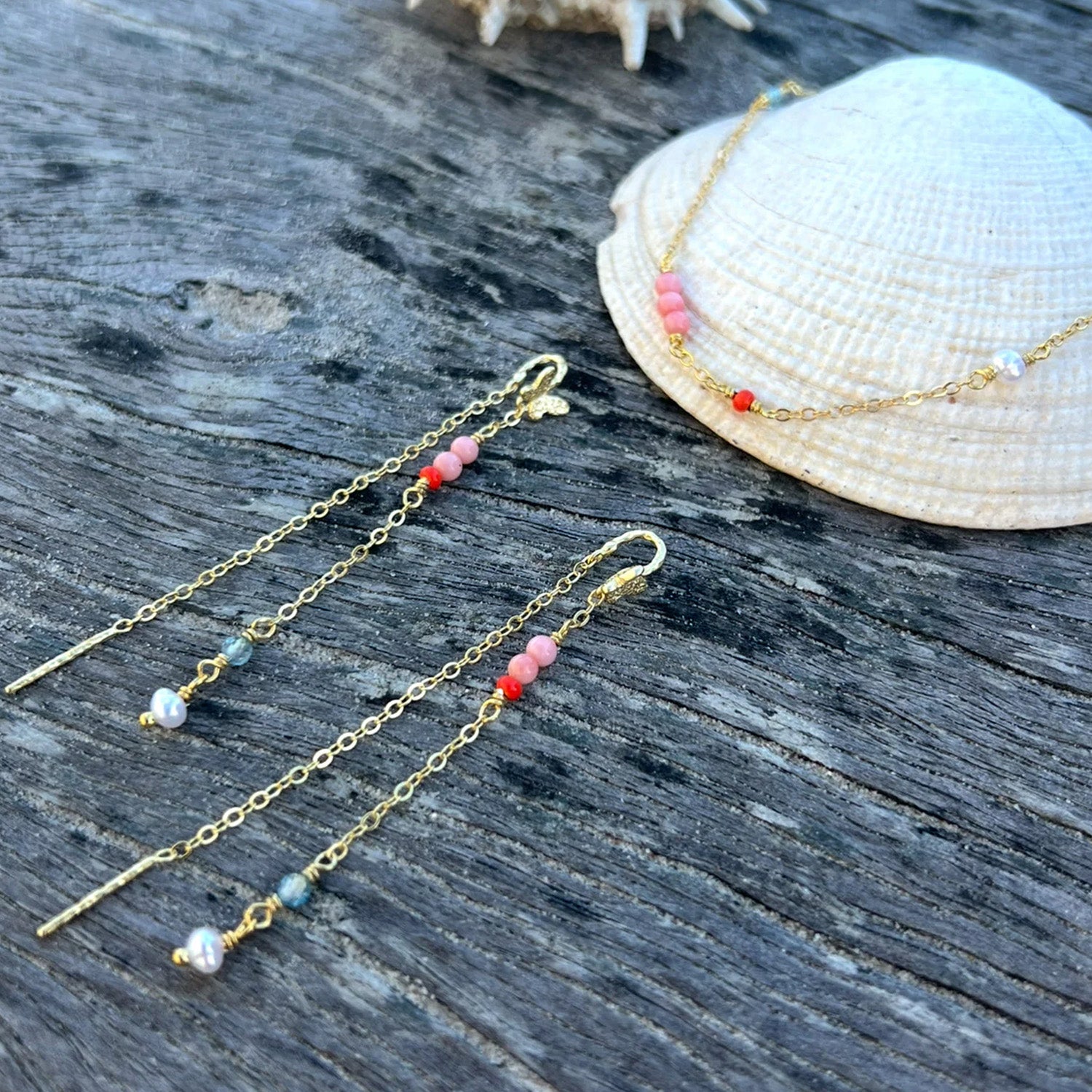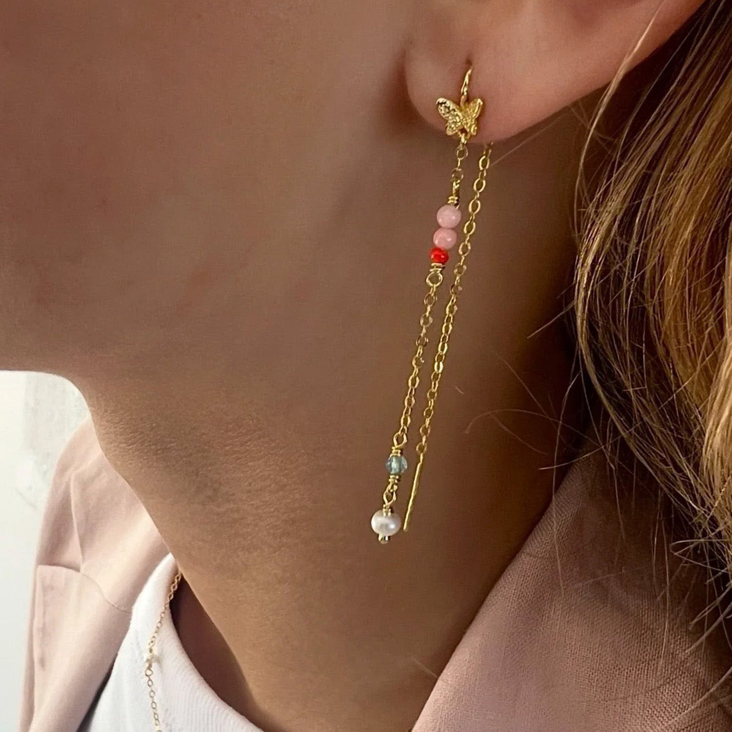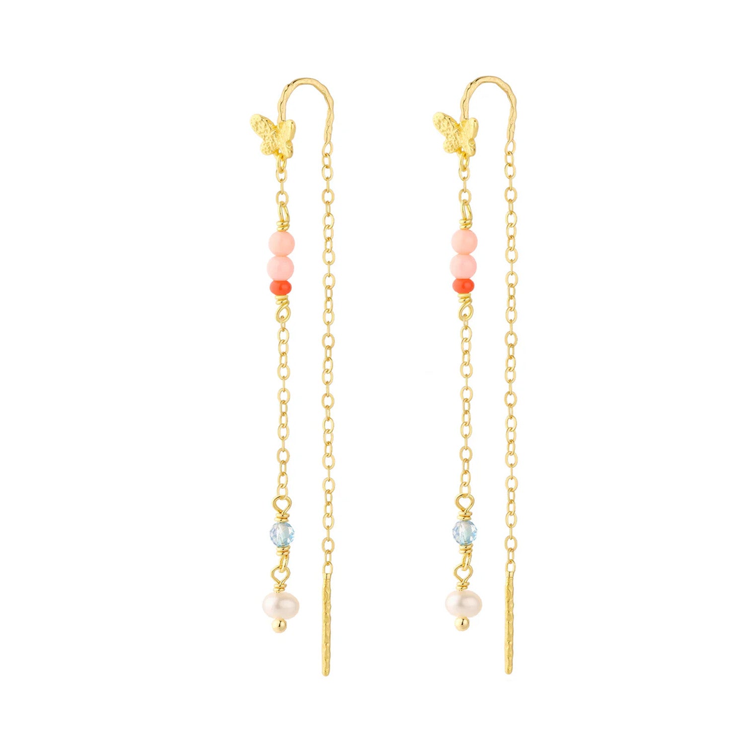 Øreringene er udsmykket med delikate kæder og farverige perler, der skaber en legende og sofistikeret stil. Den gyldne farve af forgyldt sølv harmonerer smukt med de bløde nuancer af lyserøde og blå perler, hvilket giver et friskt og moderne udtryk. De små sommerfugle ved krogene tilføjer en ekstra dimension af elegance og femininitet.
