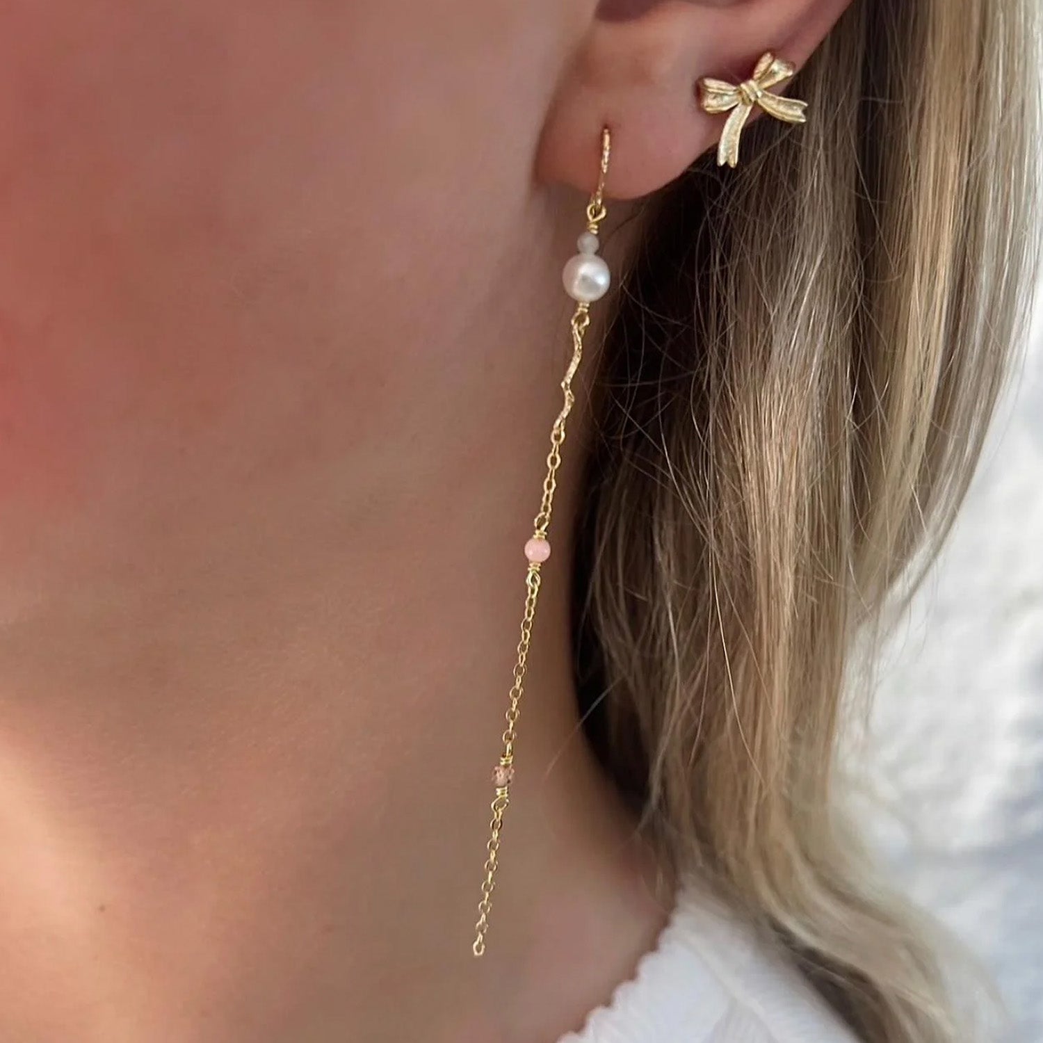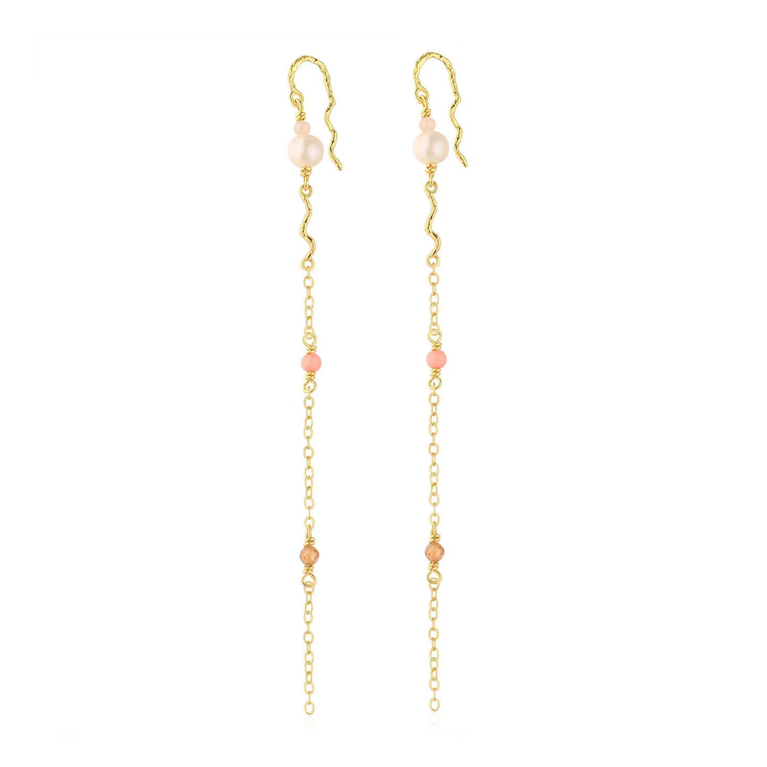 Øreringene har en delikat kæde, der falder yndefuldt fra øret, og de små perler tilføjer et strejf af farve og liv. Den gyldne nuance af forgyldt sølv skaber en varm glød, der komplementerer enhver hudtone. Designet er både moderne og klassisk, hvilket gør dem alsidige og tidløse.
