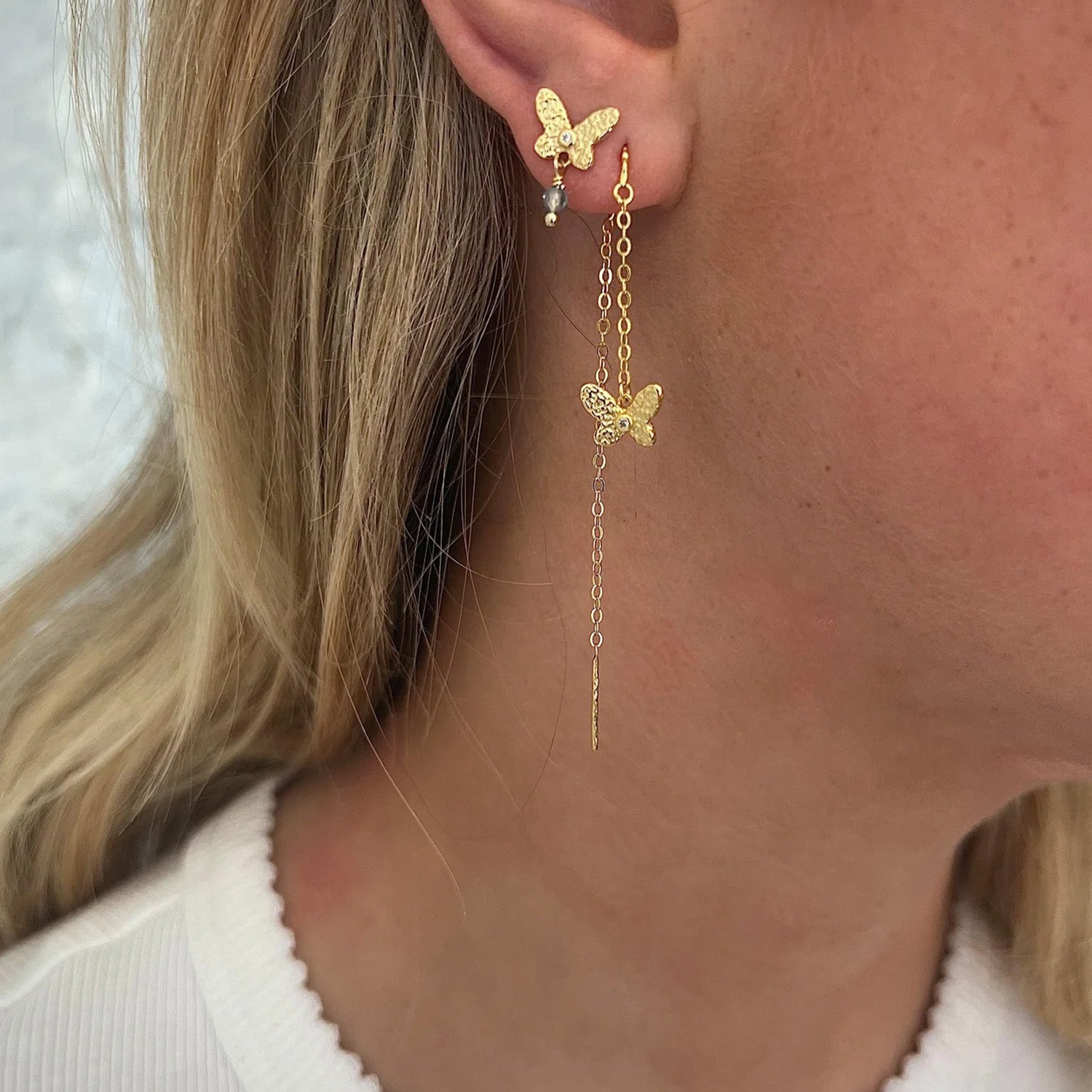 Øreringene er udført i en smuk forgyldt finish, der fanger lyset på en subtil og sofistikeret måde. De delikate kæder og sommerfugleformede vedhæng tilføjer en legende elegance, der gør dem til et iøjnefaldende valg. Den fine tekstur og den gyldne nuance skaber en varm og indbydende følelse, der komplementerer enhver stil.