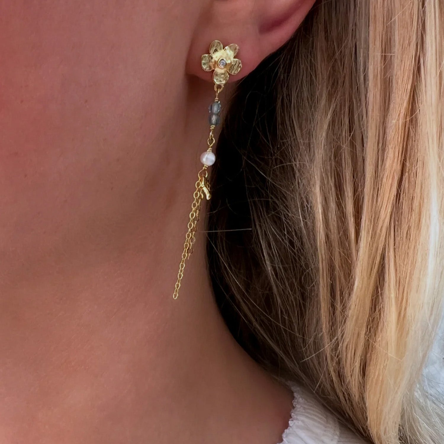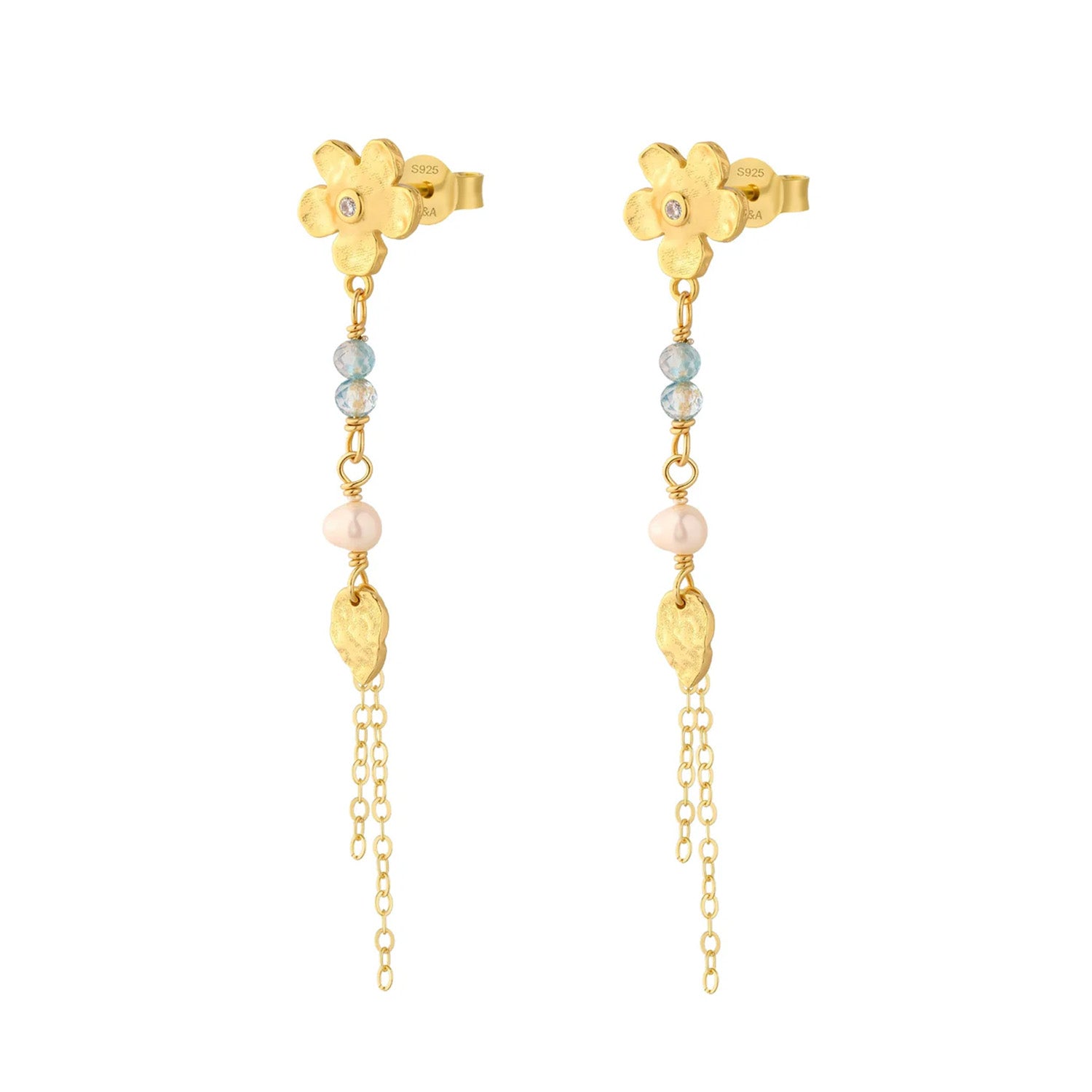 Øreringene har en smuk guldfarvet finish, der fanger lyset på en subtil måde. De små, delikate kæder og perler skaber en elegant bevægelse, når du bærer dem. Blomsterdesignet tilføjer en feminin og romantisk følelse, mens de klare sten giver et diskret glimt. Kombinationen af teksturer og farver gør disse øreringe til et alsidigt tilbehør, der kan løfte ethvert outfit.