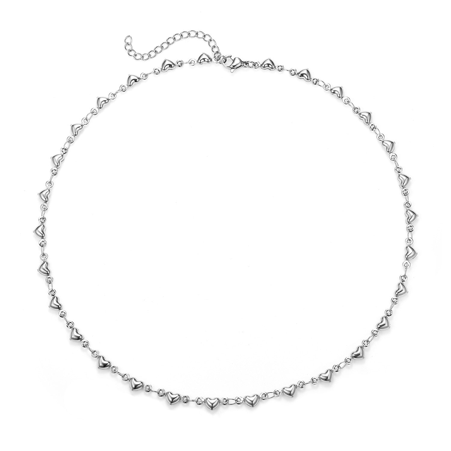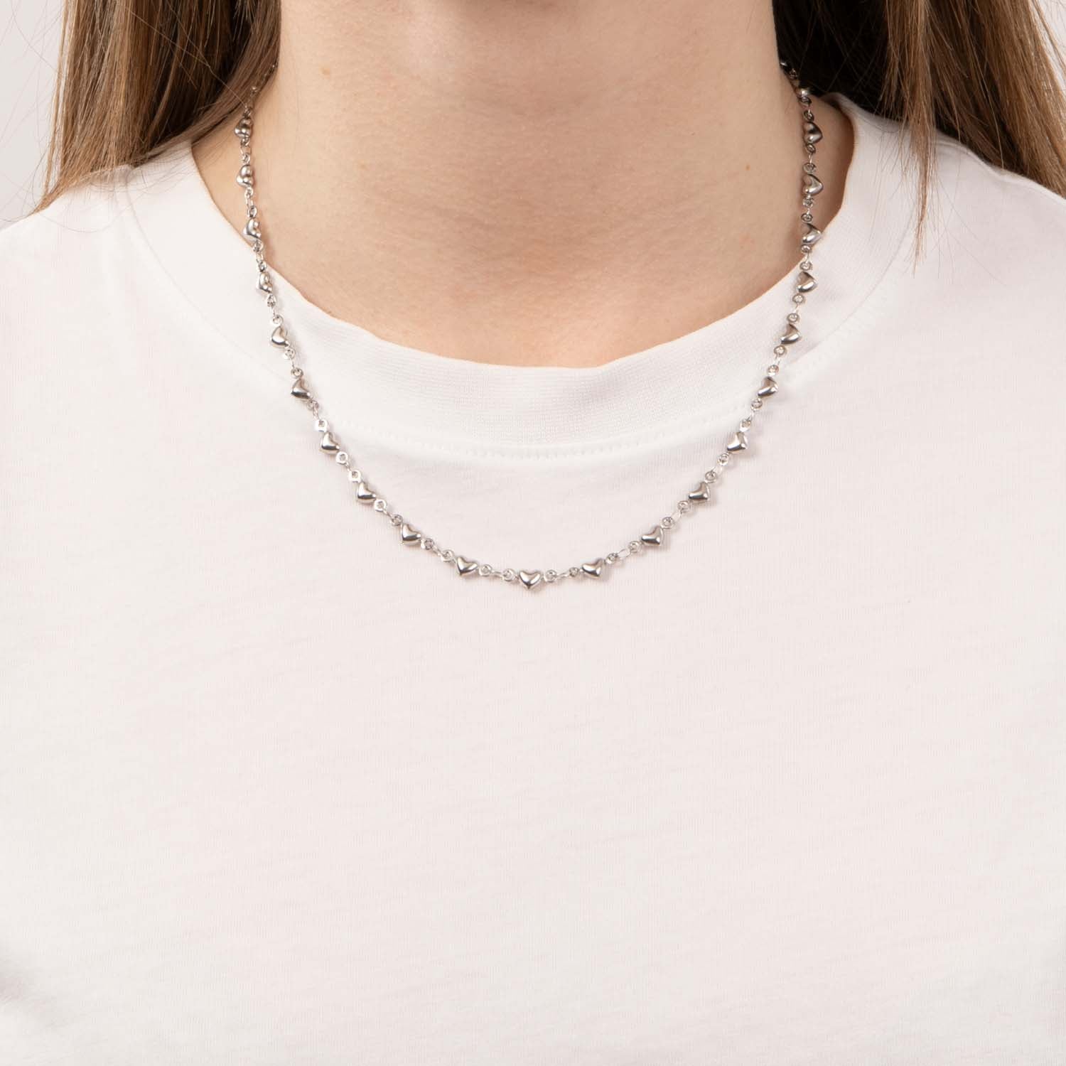 Halskæden er udført i rustfrit stål, hvilket giver den en skinnende og moderne finish. De små hjerteformede elementer, der pryder kæden, tilføjer en subtil romantisk charme. Med en længde på 42 cm og en ekstra 3 cm forlængelse, kan du nemt justere den til din ønskede pasform.