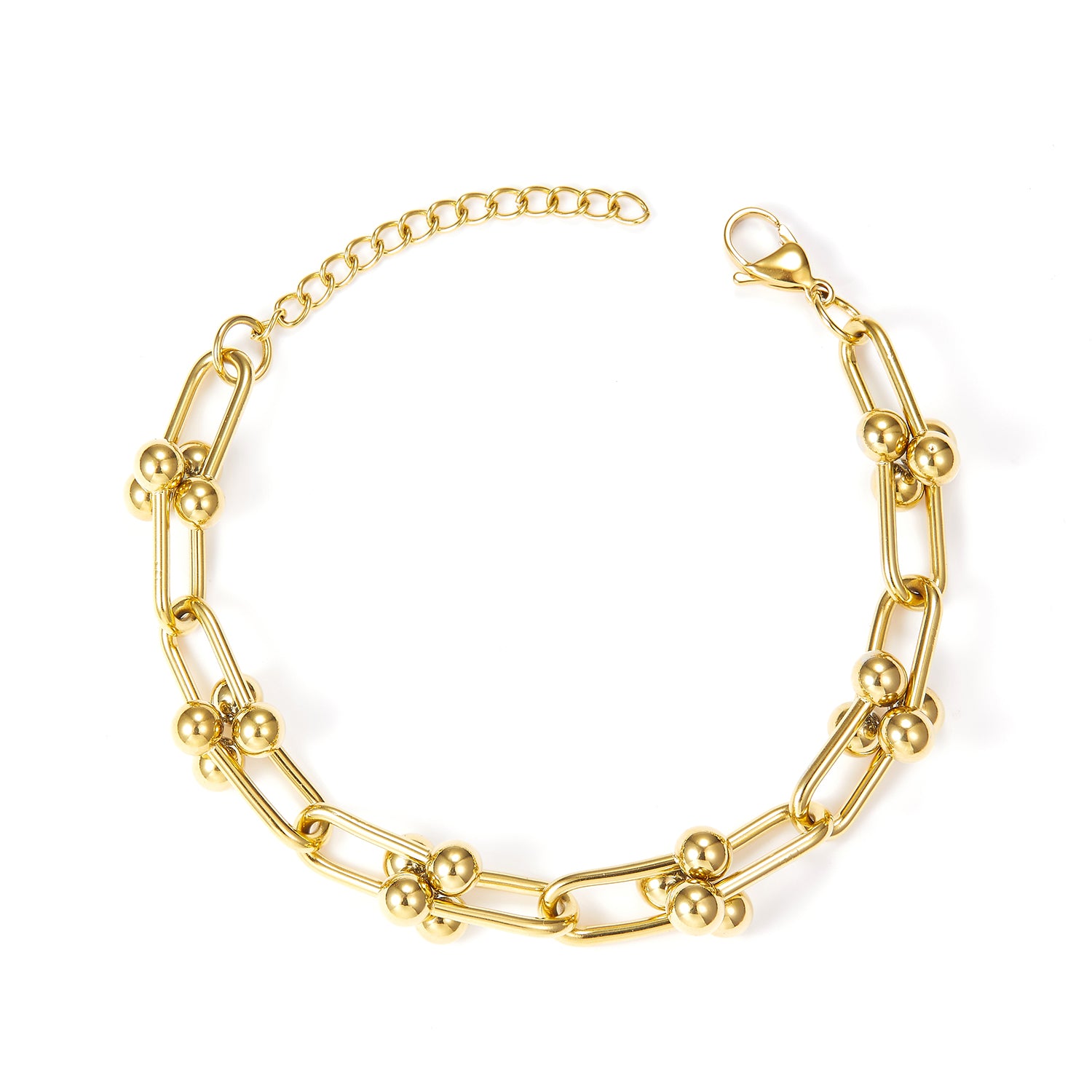 Armbåndet er designet med en række sammenkoblede led, der skaber en harmonisk balance mellem enkelhed og raffinement. Den gyldne farve fremhæver armbåndets elegante struktur og giver det en varm, indbydende glød. De små kugler, der er jævnt fordelt langs kæden, tilføjer en subtil detalje, der fanger lyset smukt.