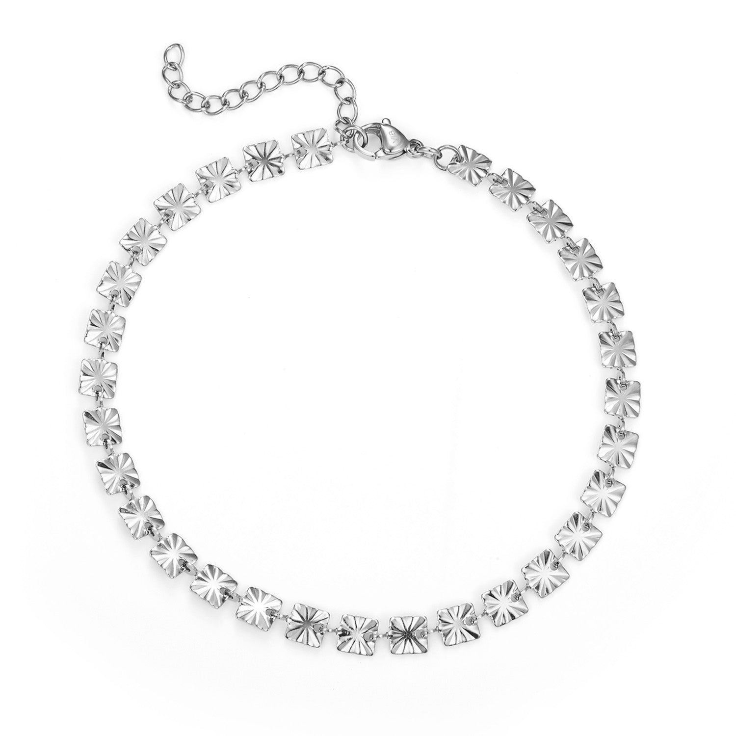 Den Raio Quadra ankelkæde er en fryd for øjet med sine delikate firkantede led, der reflekterer lyset smukt. Den sølvfarvede finish giver et moderne og stilrent udtryk, der passer til både hverdag og festlige lejligheder. Kædens tekstur er glat og behagelig mod huden, hvilket gør den ideel til daglig brug. Kædens mønster på pladerne er identisk på for- og bagsiden.