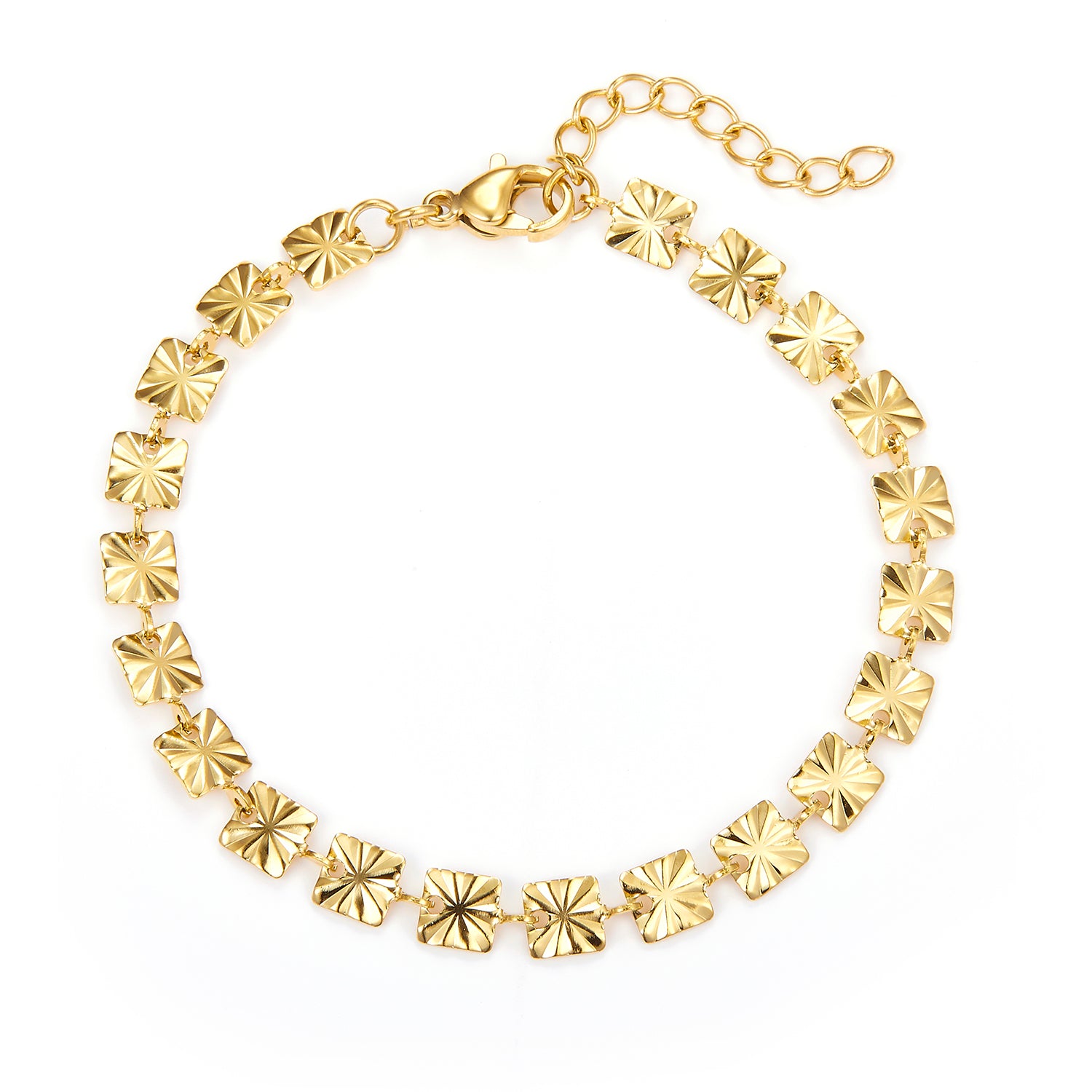 Armbåndet består af små, firkantede led, der skaber et moderne og stilfuldt udtryk. Den gyldne farve giver en varm og indbydende glød, der komplementerer enhver hudtone. Hvert led er omhyggeligt poleret for at opnå en glat og skinnende overflade, der føles behagelig mod huden. Kædens mønster på pladerne er identisk på for- og bagsiden.