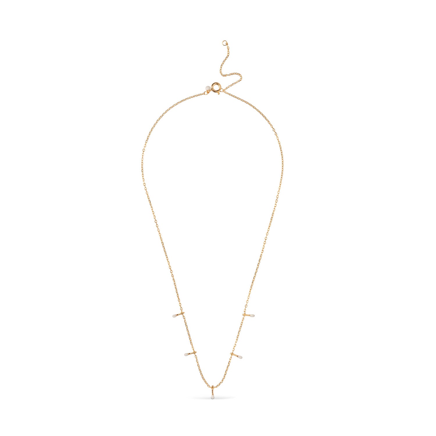 Halskæden udstråler en subtil elegance med sine fine, gyldne nuancer, der smukt komplementerer de hvide elementer. Den delikate kæde fremhæver de små, dråbeformede vedhæng, som tilføjer et strejf af femininitet og raffinement.