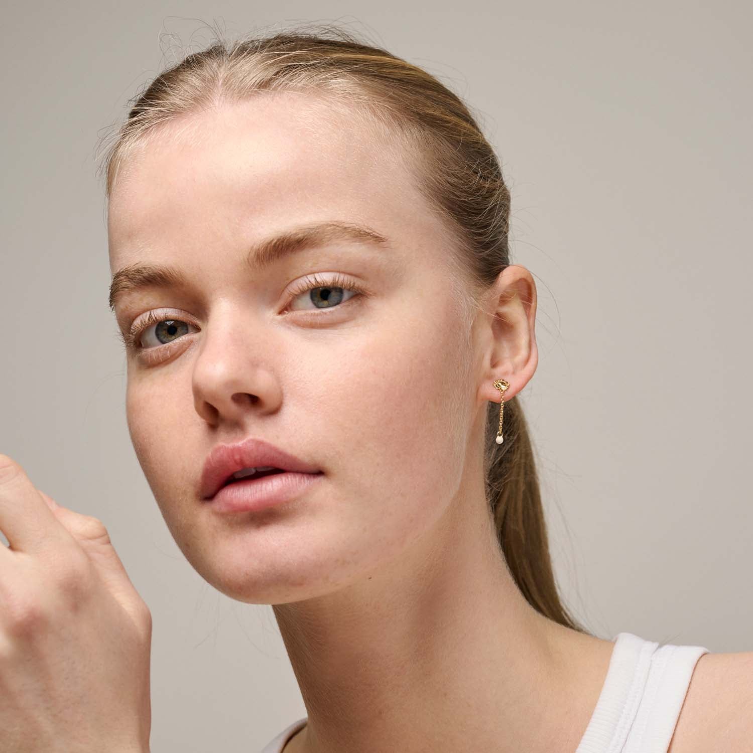 Øreringene er udsmykket med en smuk solblomst, der hænger elegant fra en fin kæde. Den gyldne farve skinner blidt og tilføjer en varm glød til dit ansigt. Den lille perle i bunden af kæden giver et sofistikeret touch, der fanger lyset på en subtil måde.