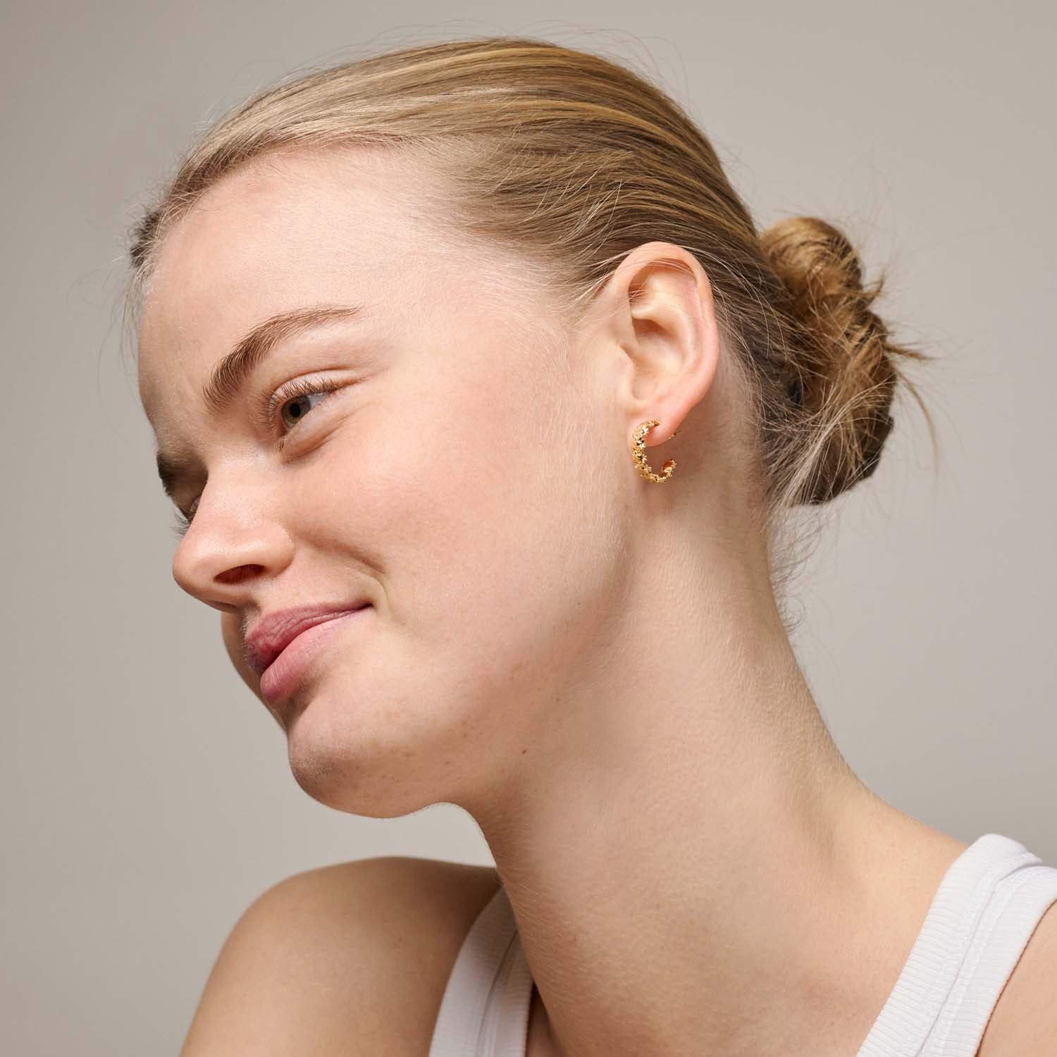 Disse hoops er en fryd for øjet med deres smukke, gyldne glans. De små, detaljerede blomsterlignende mønstre giver en følelse af lethed og elegance. Øreringene er designet til at fange lyset på en måde, der fremhæver deres skinnende overflade og tilføjer en subtil glød til dit look.