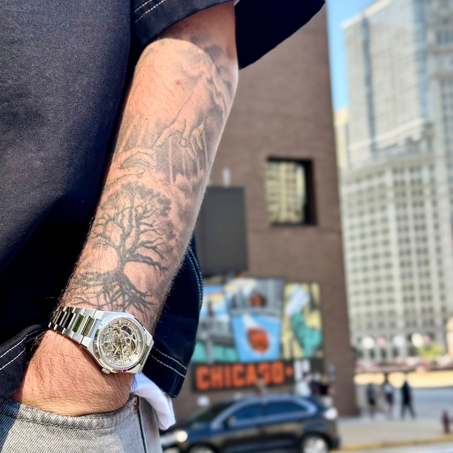 Urets sølvfarvede rustfri stål giver en sofistikeret glans, der komplementerer enhver garderobe. Med en diameter på 40 mm er det en perfekt balance mellem diskret elegance og markant tilstedeværelse. Det åbne skeletdesign fremhæver det indre mekaniske urværk, hvilket skaber en dynamisk og levende visuel effekt.