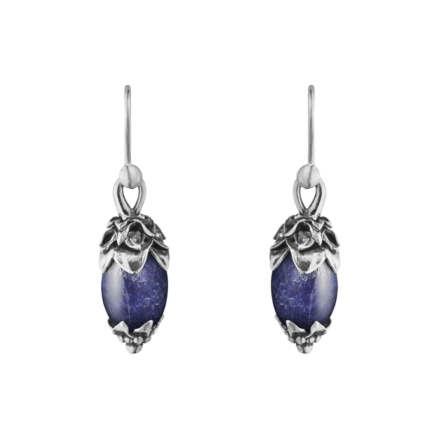 De blå sodalite-sten tilføjer en dybde og farve, der komplementerer det skinnende sølv. Øreringene har en delikat balance mellem det klassiske og det moderne, hvilket gør dem til et alsidigt tilbehør. Den blå nuance af sodalite-stenene fremhæver det elegante design og tilføjer en subtil farve, der fanger lyset smukt.