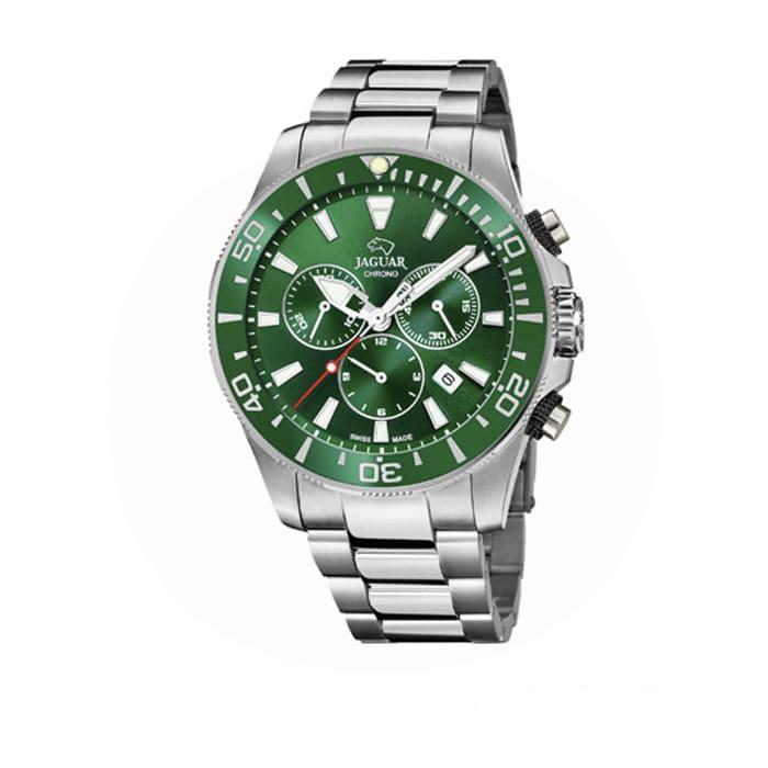 Herreur fra Jaguar i rustfrit stål med grøn urskive med datovisning og kronograffunktion. Uret har en dykkerkrans og er velegnet til dykning.