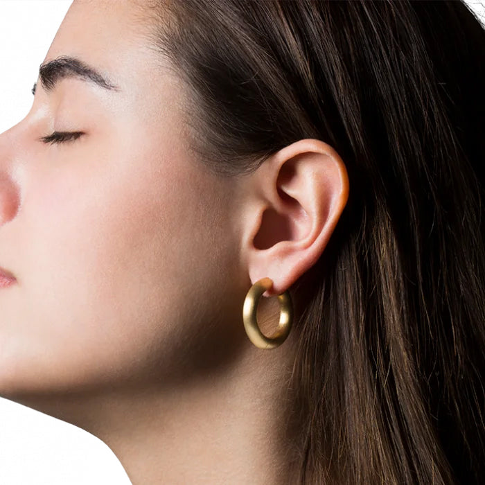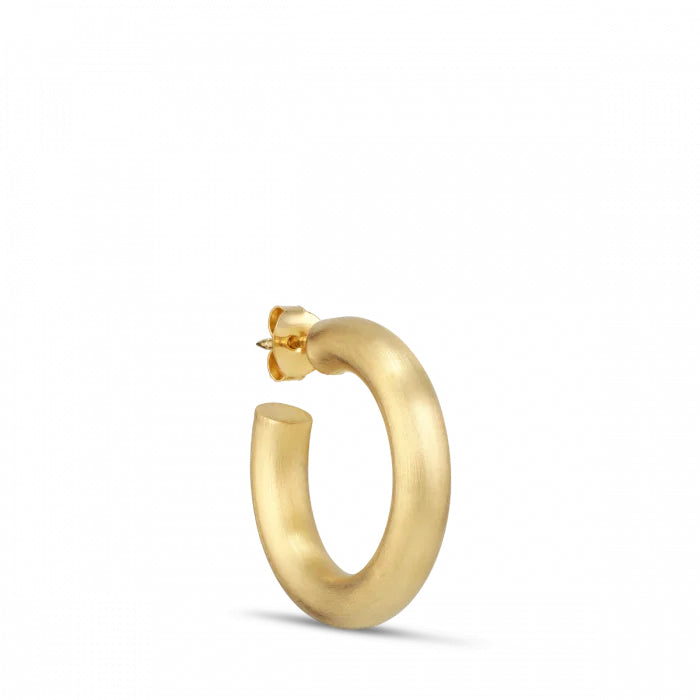 Øreringenes guldglød komplementeres af den matte finish, der tilfører et moderne twist til det klassiske hoop-design. Denne kombination skaber en unik tekstur, der føles både luksuriøs og jordnær. Øreringenes solide konstruktion og kvalitetsmateriale sikrer, at de kan bæres igen og igen, mens de forbliver smukke og holdbare. Jane Kønig er kendt for sit håndværk og design, og disse øreringe er ingen undtagelse. De er skabt til den bevidste kvinde, der værdsætter håndværk og stil.