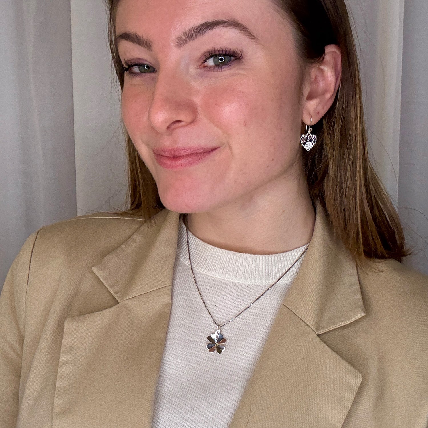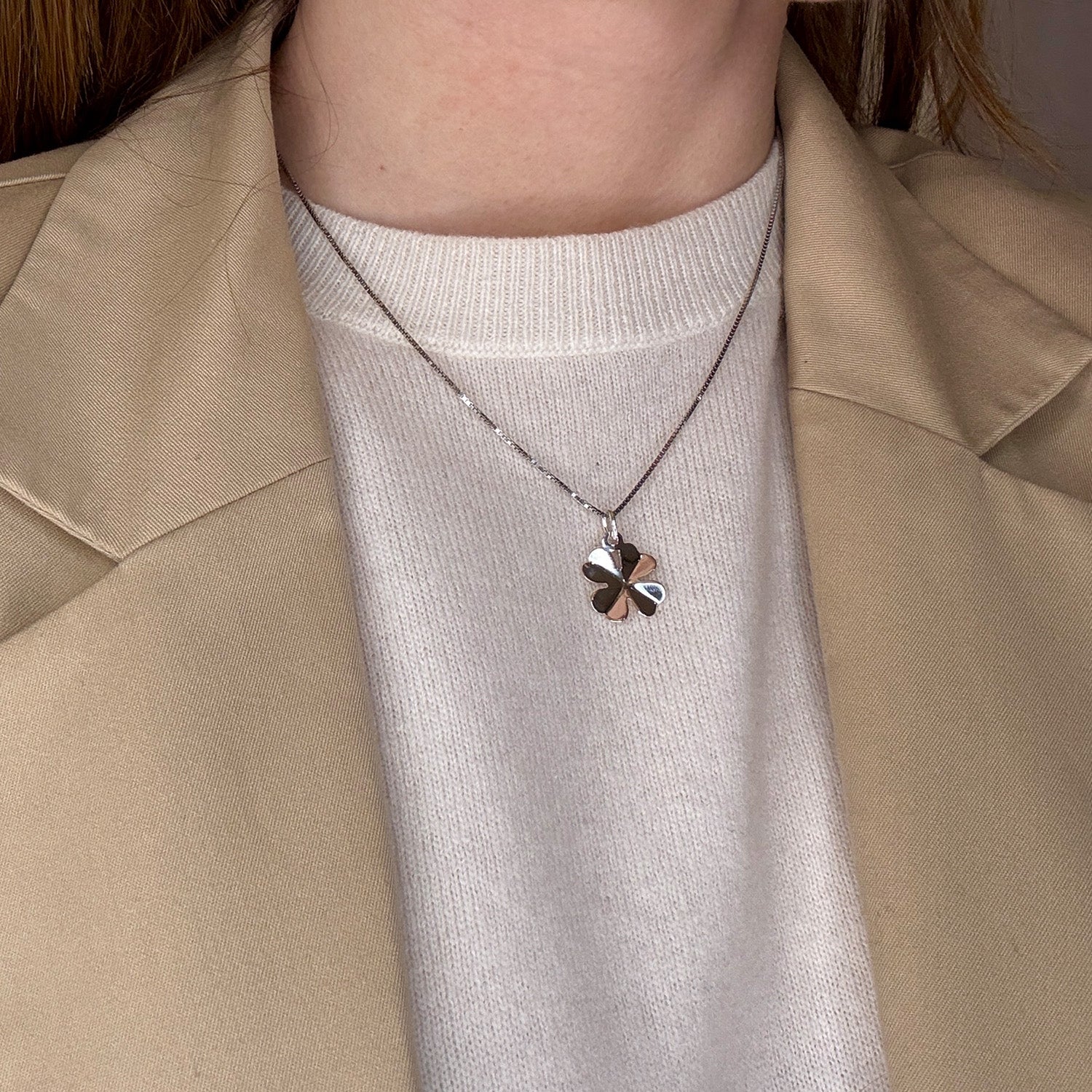 Dette vedhæng er udført i skinnende sølv, der fanger lyset på smukkeste vis. Den glatte overflade og de bløde kurver giver en følelse af luksus og raffinement. Kløverformen er både klassisk og moderne, hvilket gør det til et alsidigt smykke, der kan bæres til både hverdag og fest.