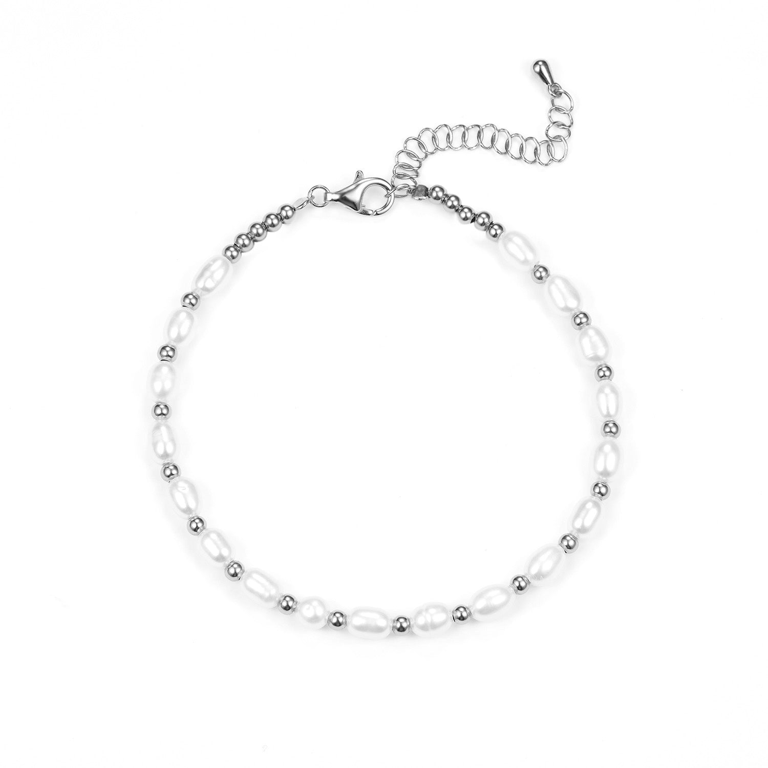 Armbåndets sølvfarvede kæde er smukt afbalanceret med de hvide perler, der skaber en harmonisk og iøjnefaldende kontrast. De små sølvkugler mellem perlerne tilføjer en ekstra dimension til designet, hvilket gør det både unikt og alsidigt.