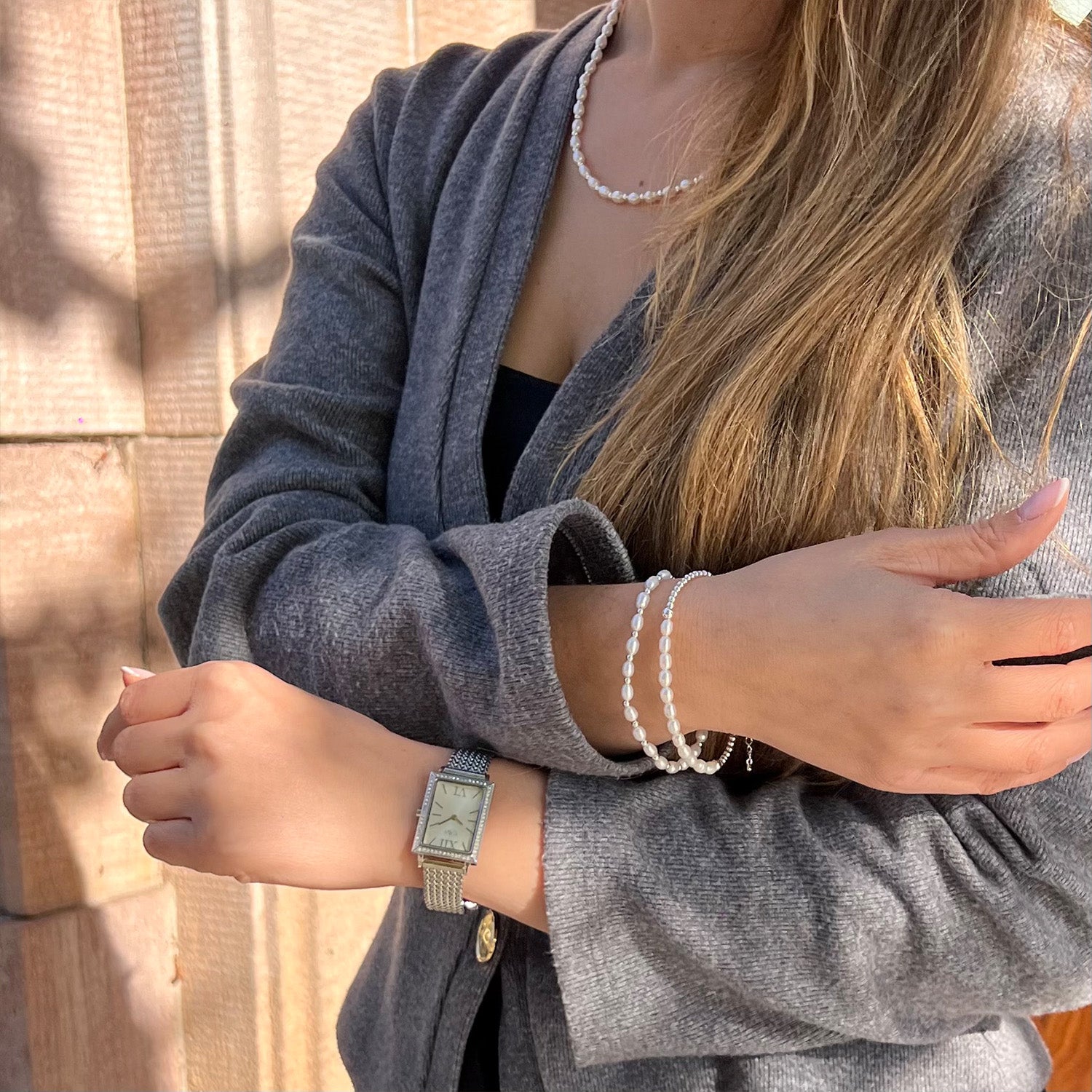 Armbåndet er udført i sølv og prydet med delikate hvide perler, der tilføjer et strejf af raffinement. Det er en perfekt kombination af klassisk design og moderne elegance.