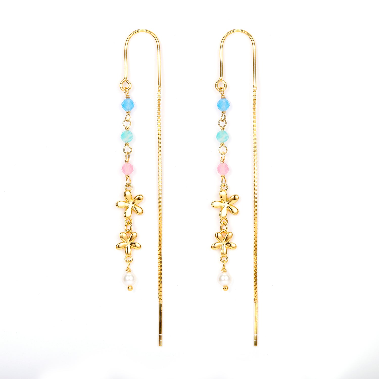 Disse øreringe er udført i forgyldt sølv og prydet med delikate blomsterdetaljer, der fremhæver deres unikke design. De gyldne nuancer kombineret med hvide og blå farver skaber en harmonisk og iøjnefaldende kontrast. Øreringene har en let og elegant struktur, der gør dem behagelige at bære hele dagen.