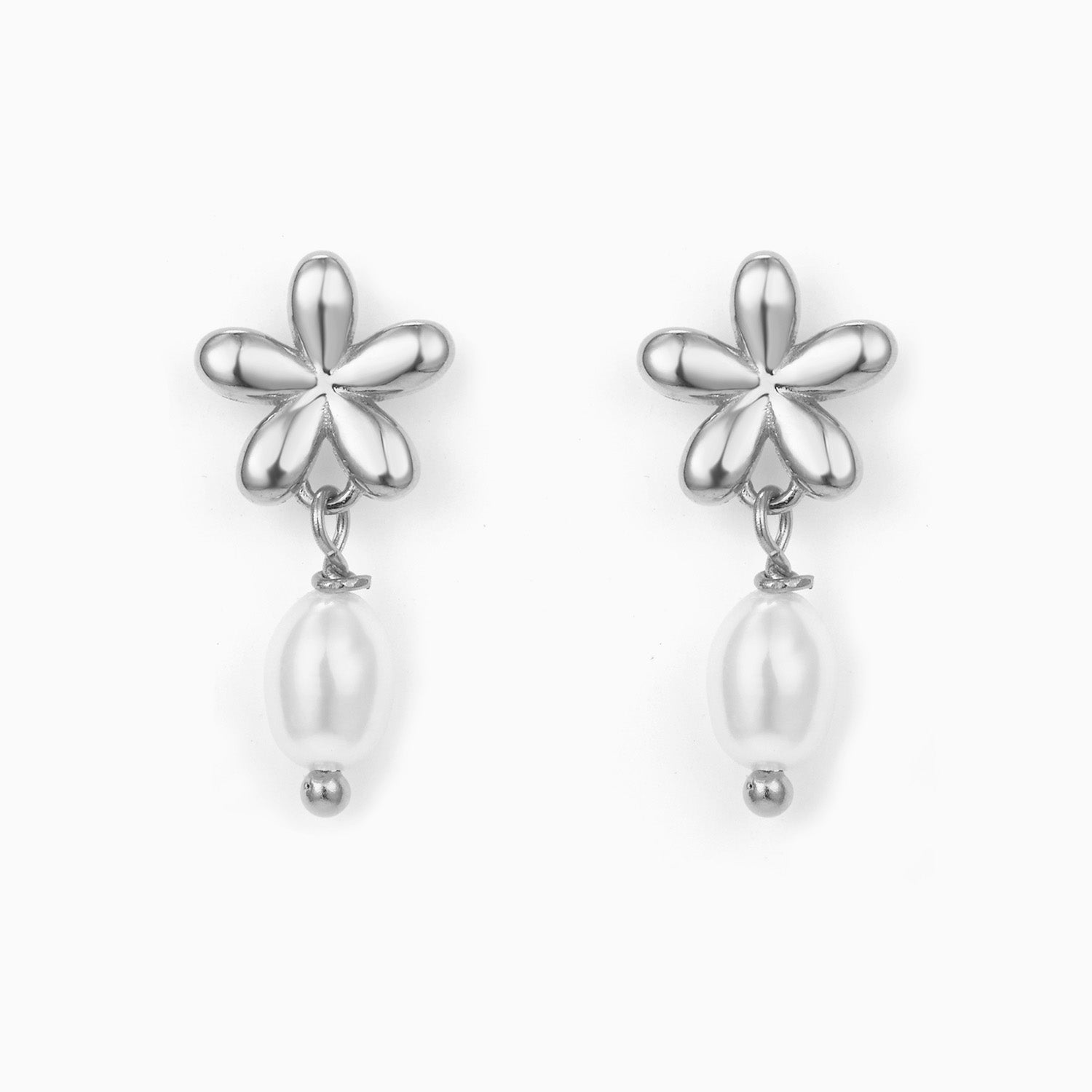 De delikate sølvblomster er smukt udformet og hænger yndefuldt fra øret, mens de hvide perler tilføjer en subtil elegance. Den glatte overflade af sølvet reflekterer lyset på en måde, der fremhæver øreringenes detaljer og giver dem en strålende glans.