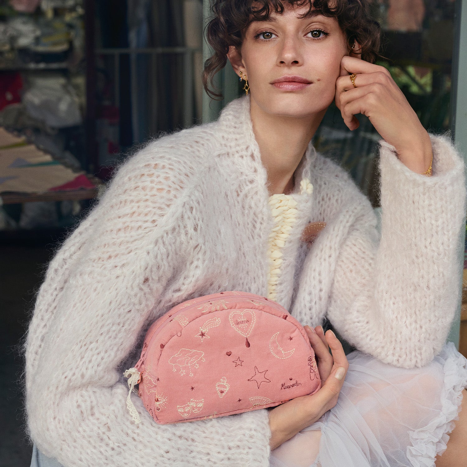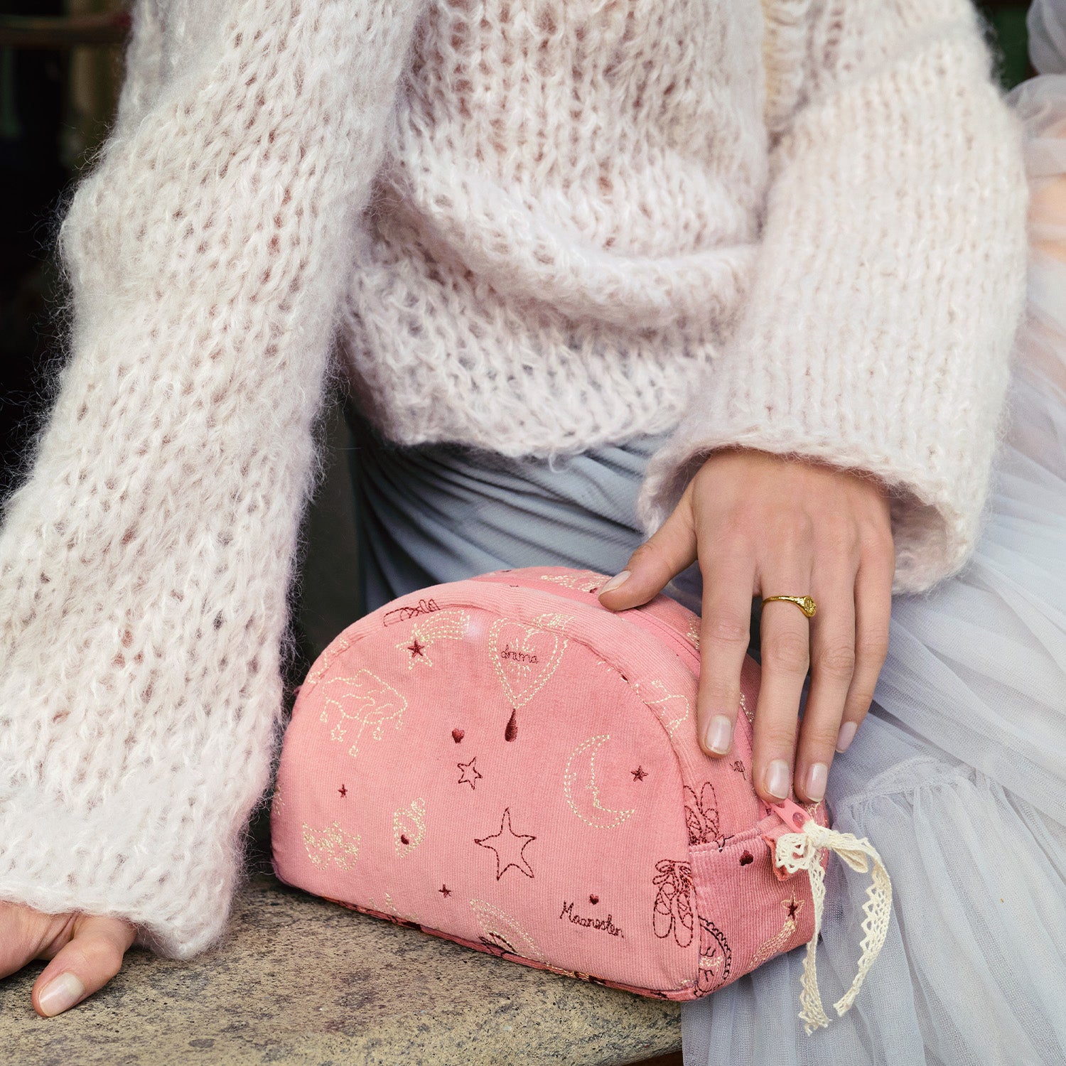 Tasken er fremstillet i blødt tekstil, der føles behageligt at røre ved, og den pink farve tilføjer et feminint touch. De delikate stjerne- og månesymboler er broderet med omhu, hvilket giver tasken en unik og charmerende karakter.