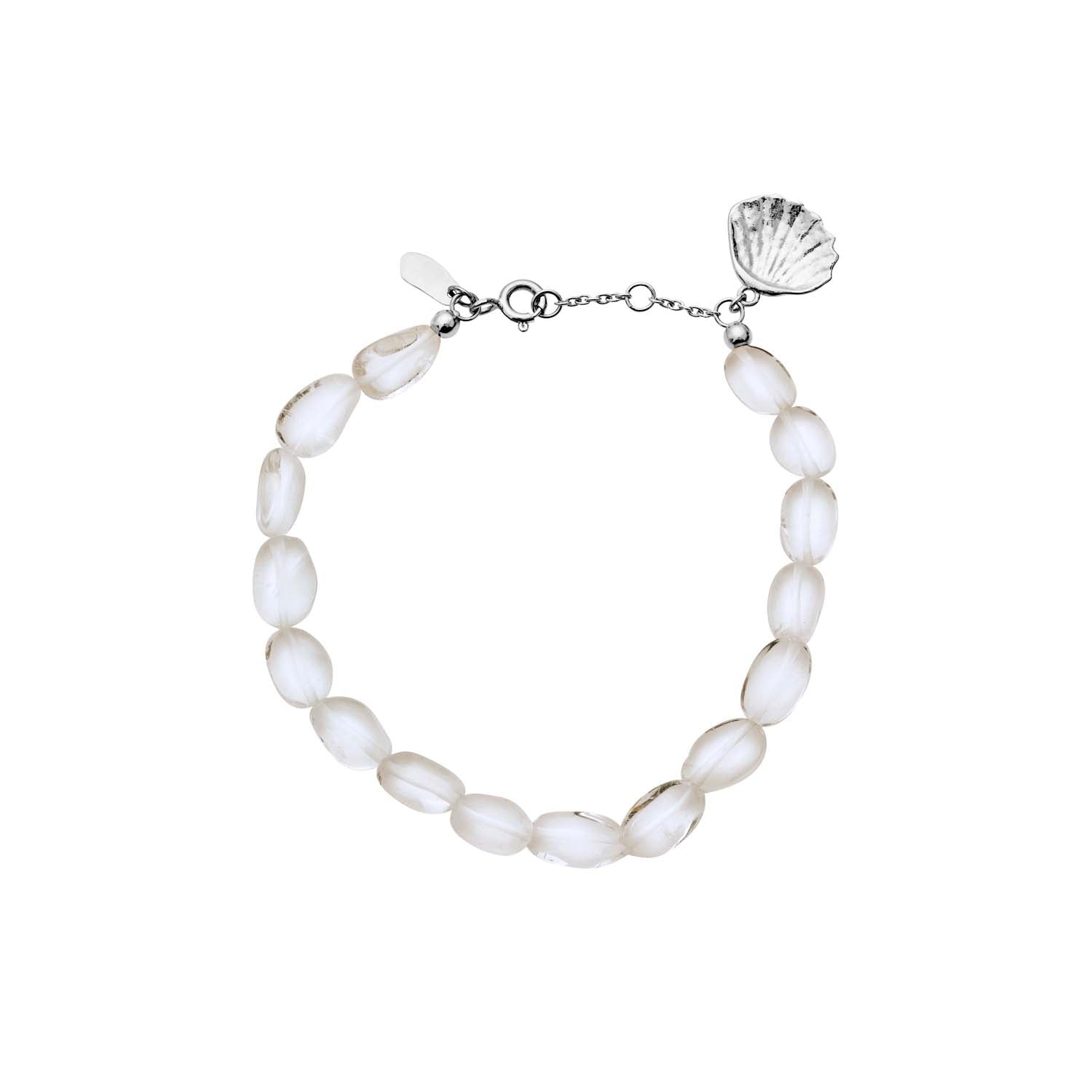 Simou armbåndet er en fryd for øjet med sine delikate, perlelignende elementer, der fanger lyset på en subtil måde. Den sølvfarvede finish giver en kølig, sofistikeret glans, der fremhæver armbåndets naturlige skønhed. Den lille muslingeskal ved låsen tilføjer en charmerende detalje, der minder om havets ro og elegance.