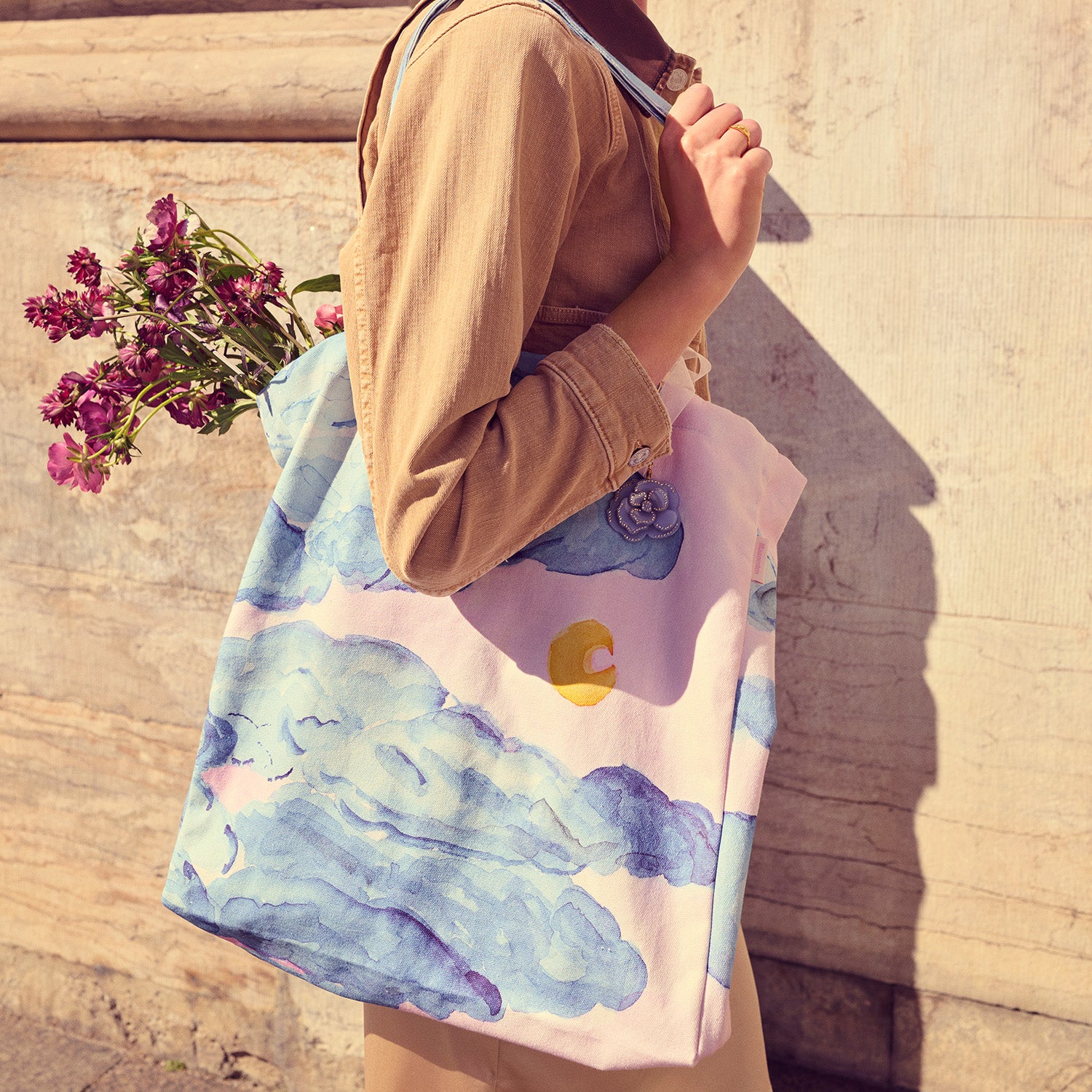 Tasken er fremstillet i blødt bomuld, der føles behageligt at røre ved. Det smukke mønster af blå skyer og en gylden måne skaber en drømmende atmosfære, der fanger øjet. De blå nuancer giver tasken en rolig og harmonisk følelse, mens den gyldne detalje tilføjer et subtilt glimt af luksus.