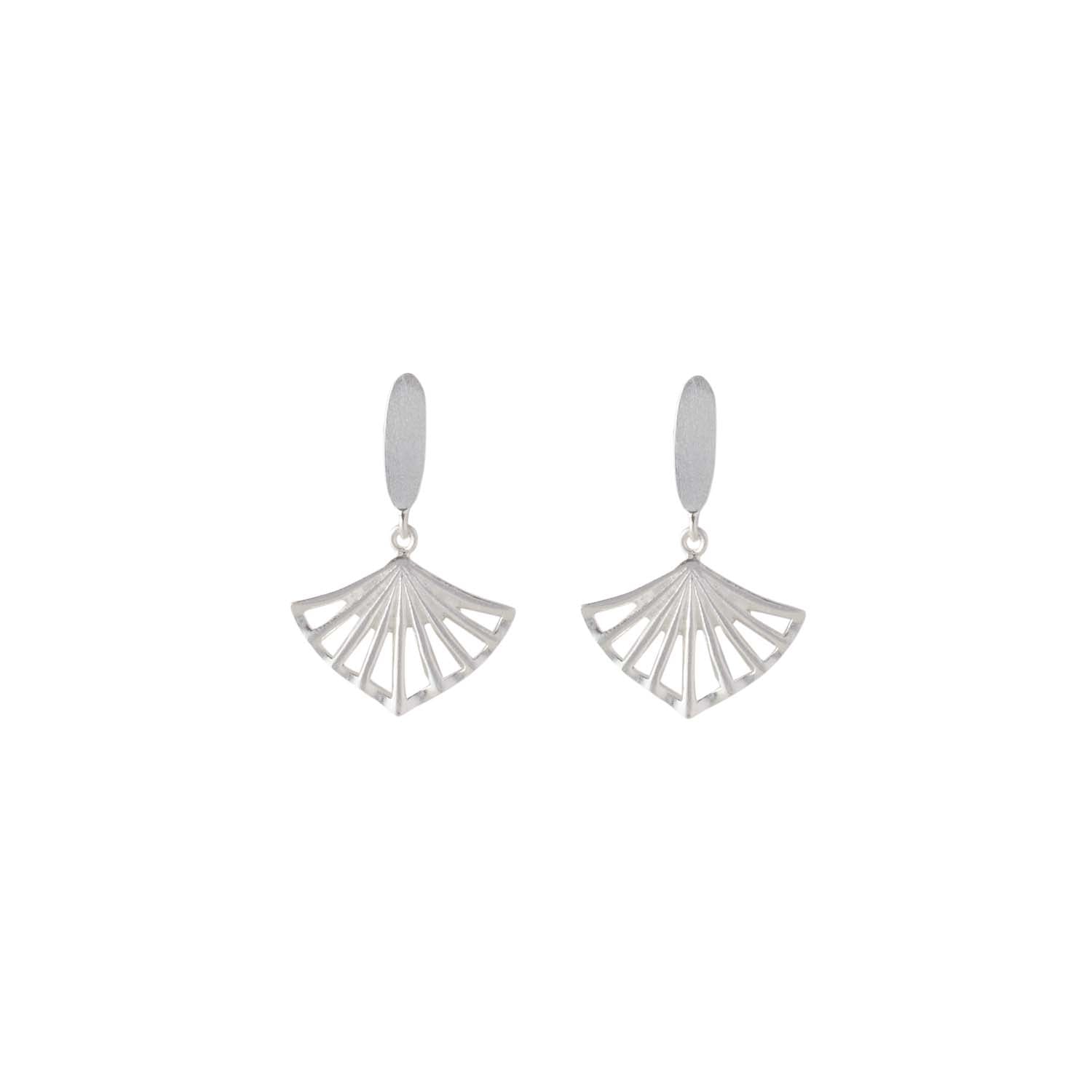 Øreringene er udført i skinnende sølv, der giver et sofistikeret og stilrent udtryk. Det åbne vifteformede design tilføjer en unik dimension, der fanger lyset smukt og skaber en subtil glans. Den glatte overflade og de præcise linjer giver en følelse af luksus og kvalitet.