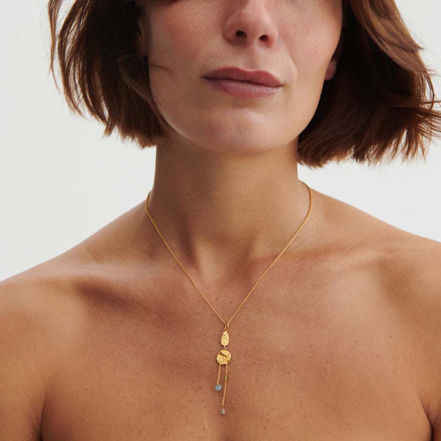 Halskæden har en delikat kæde, der smukt indrammer halsen. De små, fine vedhæng tilføjer en legende bevægelse, der fanger lyset og skaber en subtil glans. Den forgyldte overflade giver en varm tone, der komplementerer enhver hudfarve.