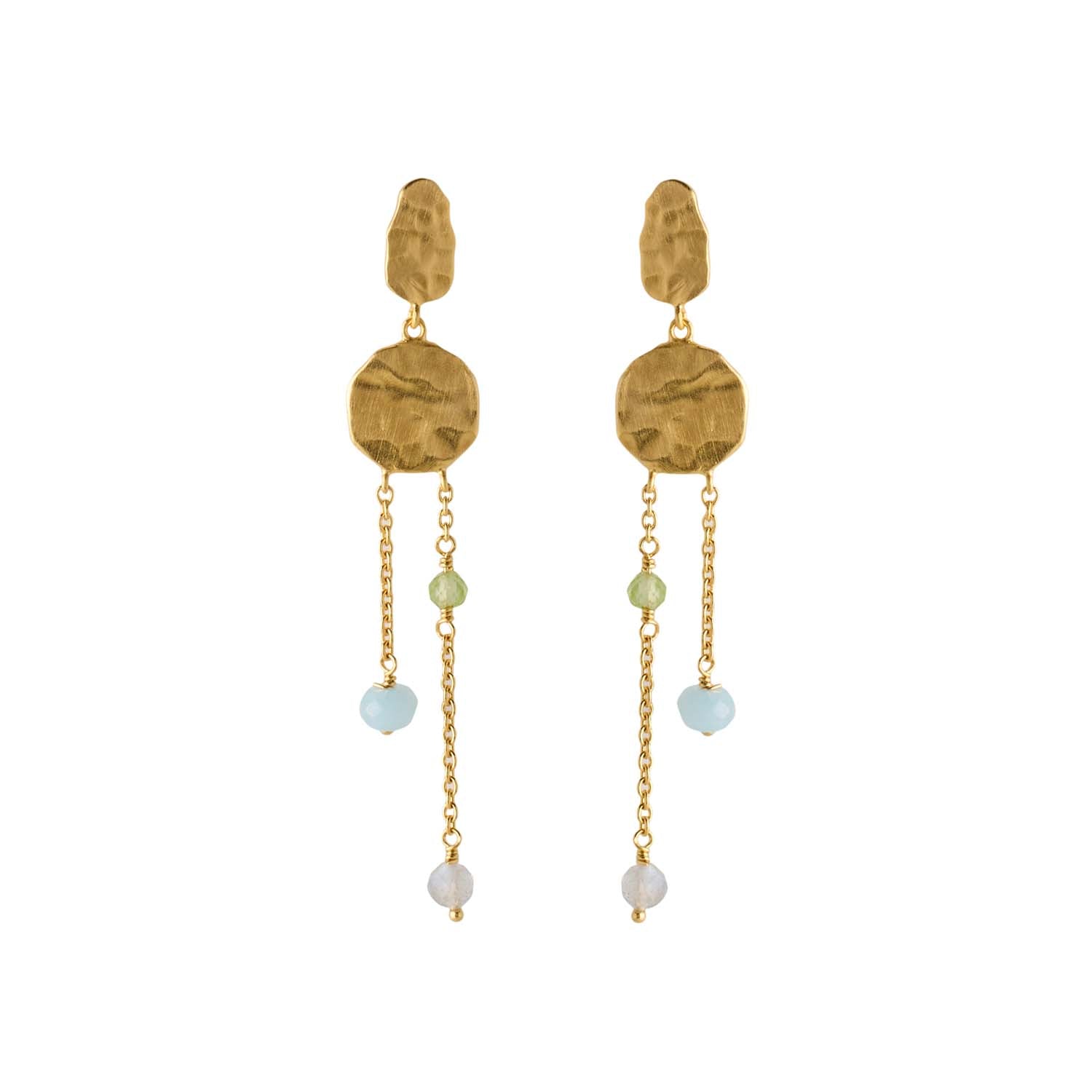 Øreringene har en smuk, gylden nuance, der fanger lyset på en sofistikeret måde. De delikate kæder og farverige perler skaber en legende bevægelse, der tiltrækker opmærksomhed uden at være overvældende. Den teksturerede overflade tilføjer en ekstra dimension, der gør dem både moderne og klassiske.